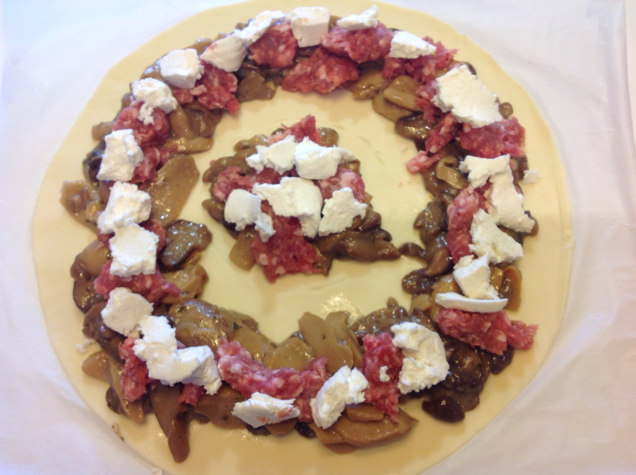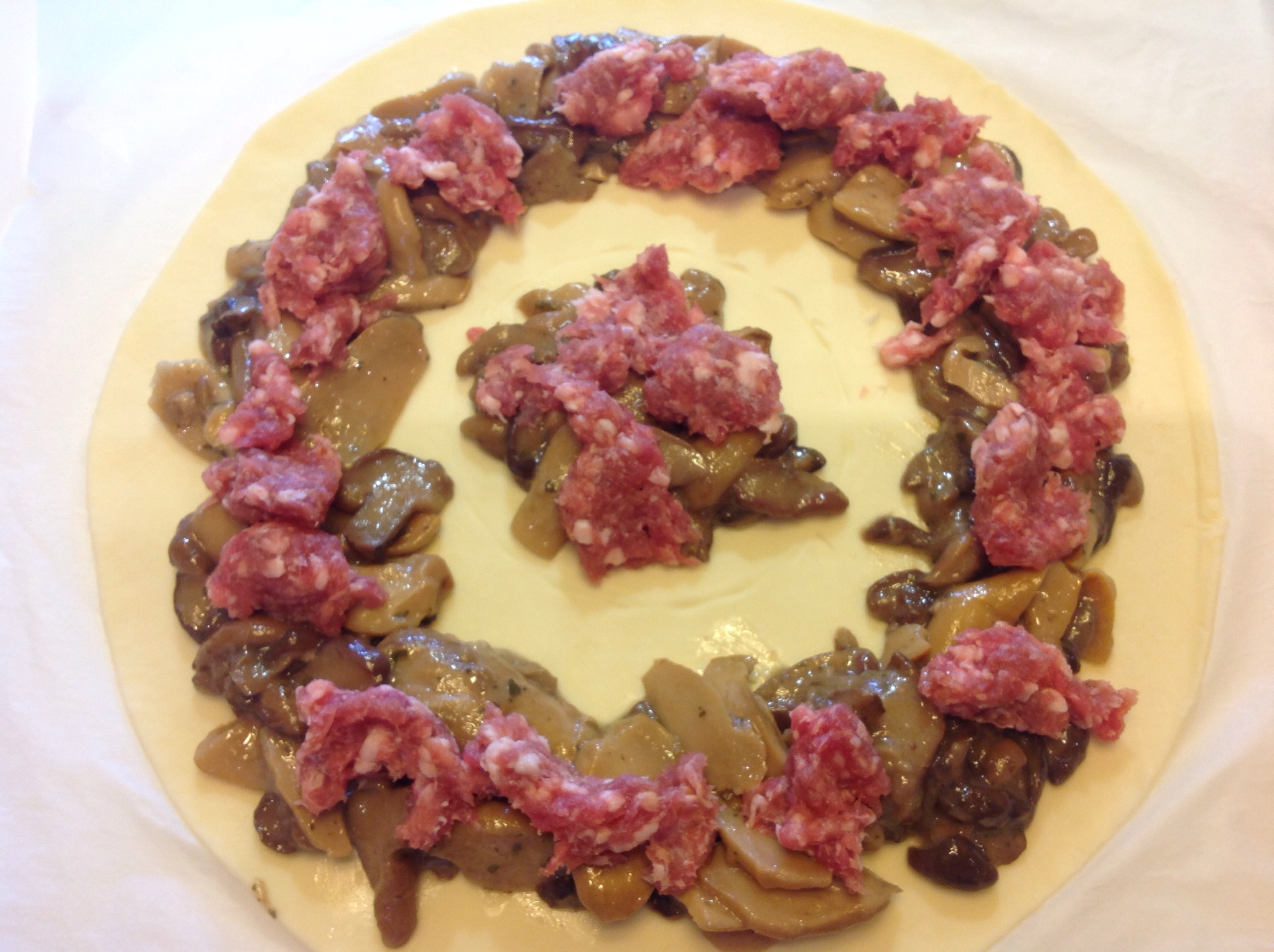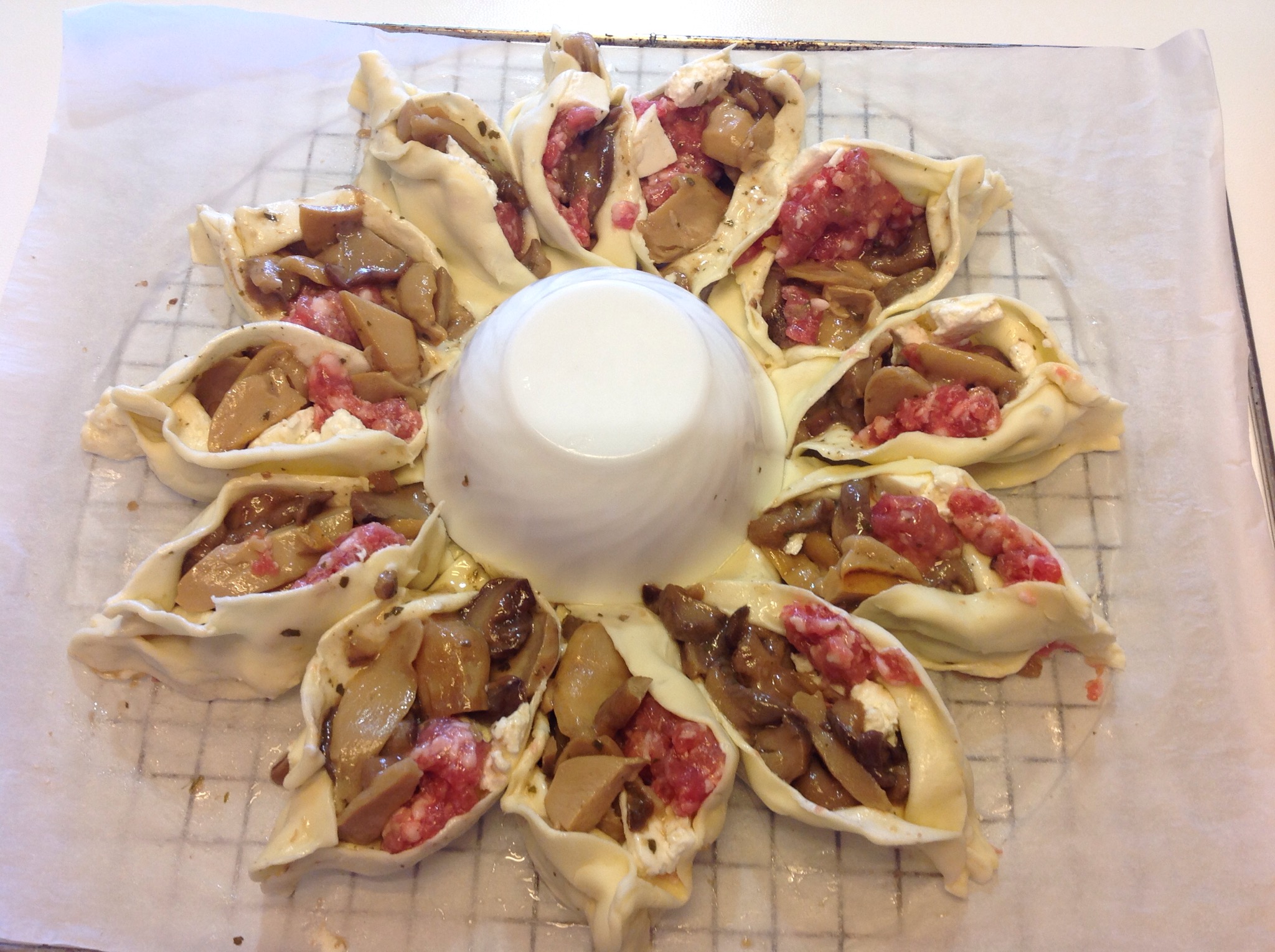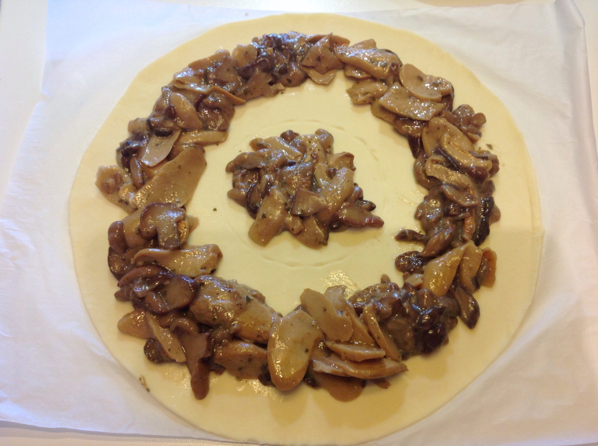 Dispongo i funghi (che ho precedentemente cotti in padella con olio, burro, uno spicchio di aglio e prezzemolo) tutti in cerchio, lasciando un bordo di almeno 2 cm e un mucchietto al centro