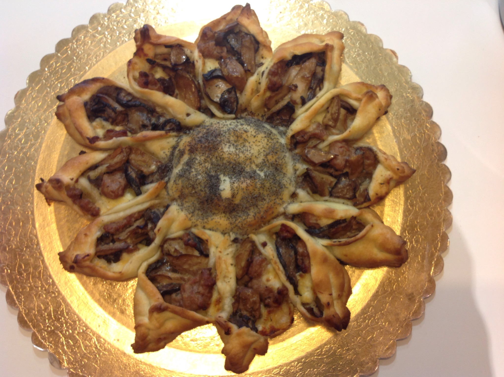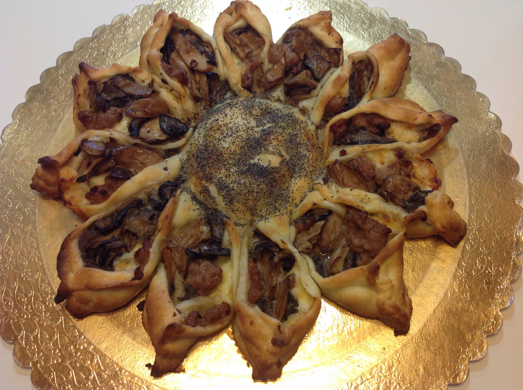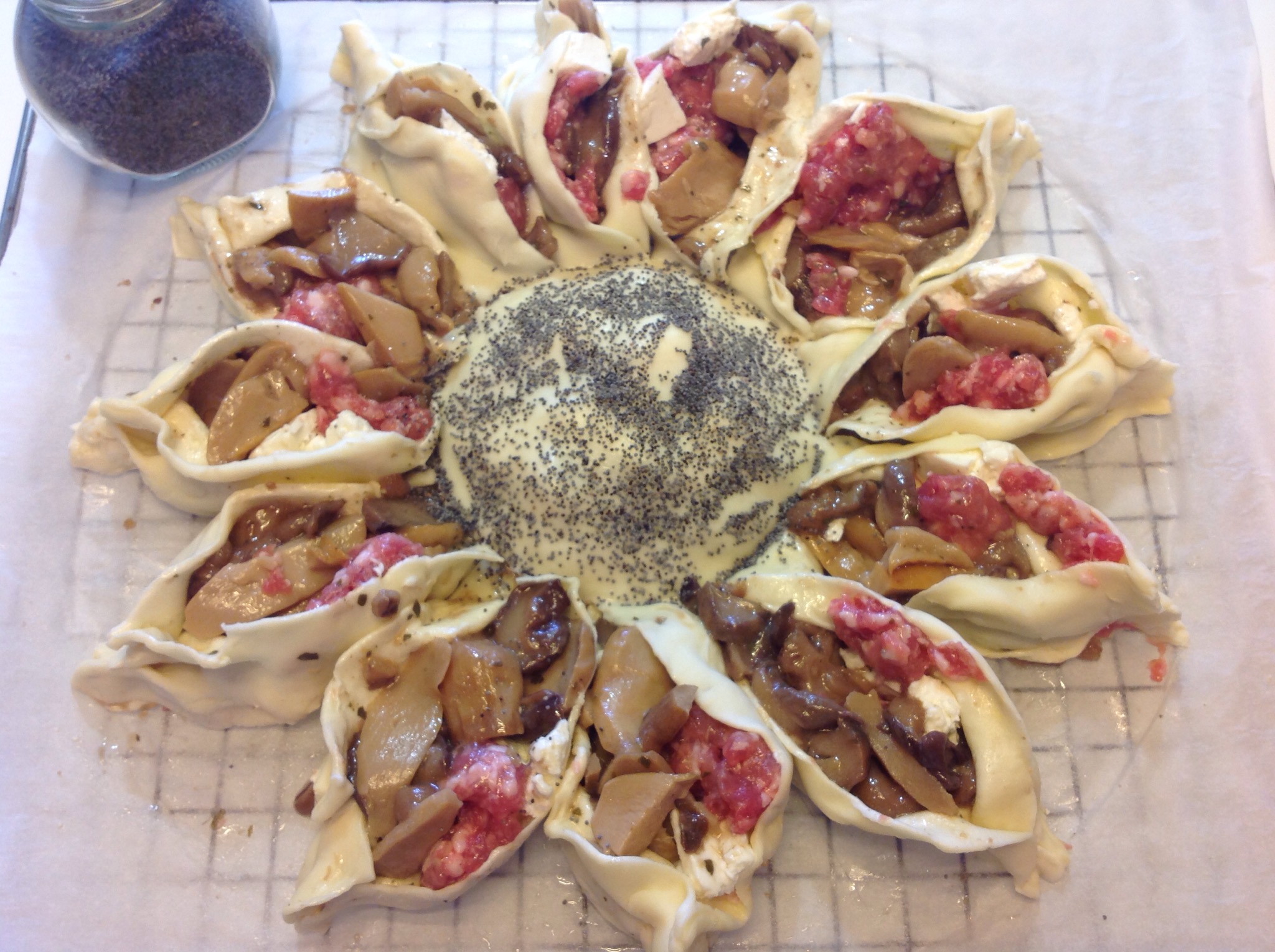 Cerco di dare una forma ordinata stringendo le punte, tolgo la ciotolina e spennello il centro nuovamente con poca acqua, cospargo con i semi di papavero