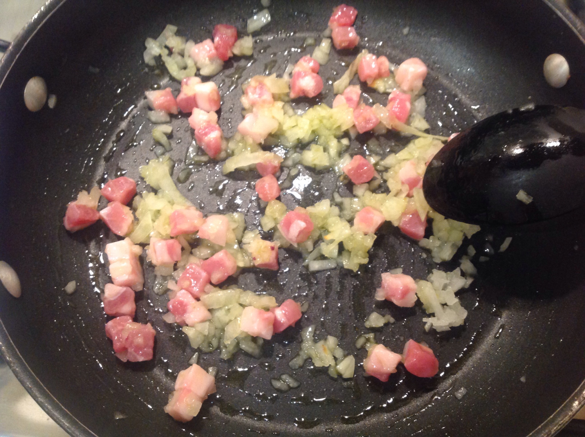 In una padella larga e bassa verso poco olio, la cipolla e la pancetta a cubetti e lascio rosolare