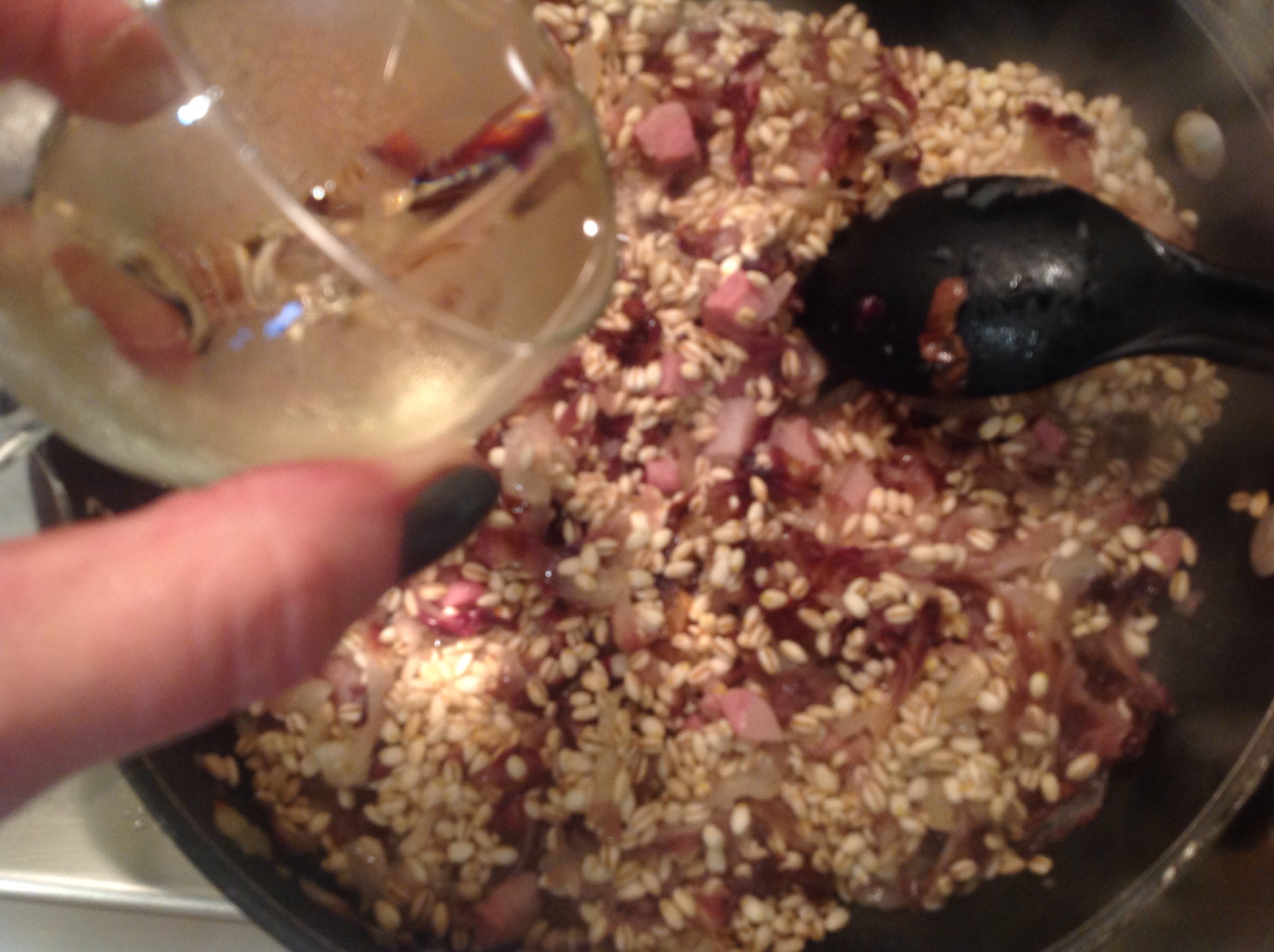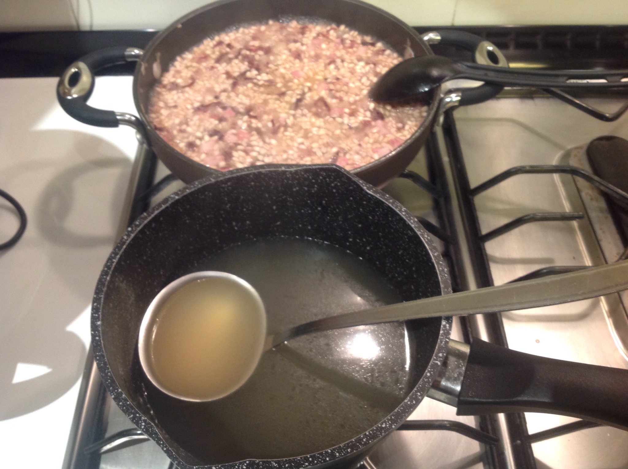 Quando il vino è evaporato inizio ad aggiungere qualche mestolo di brodo bollente come per un normale risotto