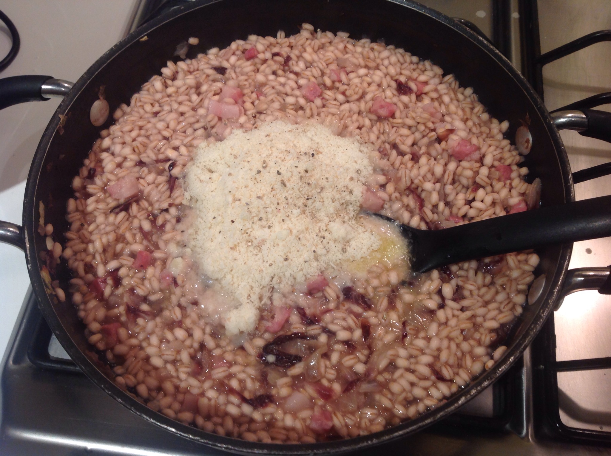 Il parmigiano e una generosa macinata di pepe, mantecate muovendo la pentola avanti e indietro, assaggiate ed eventualmente regolate di sale