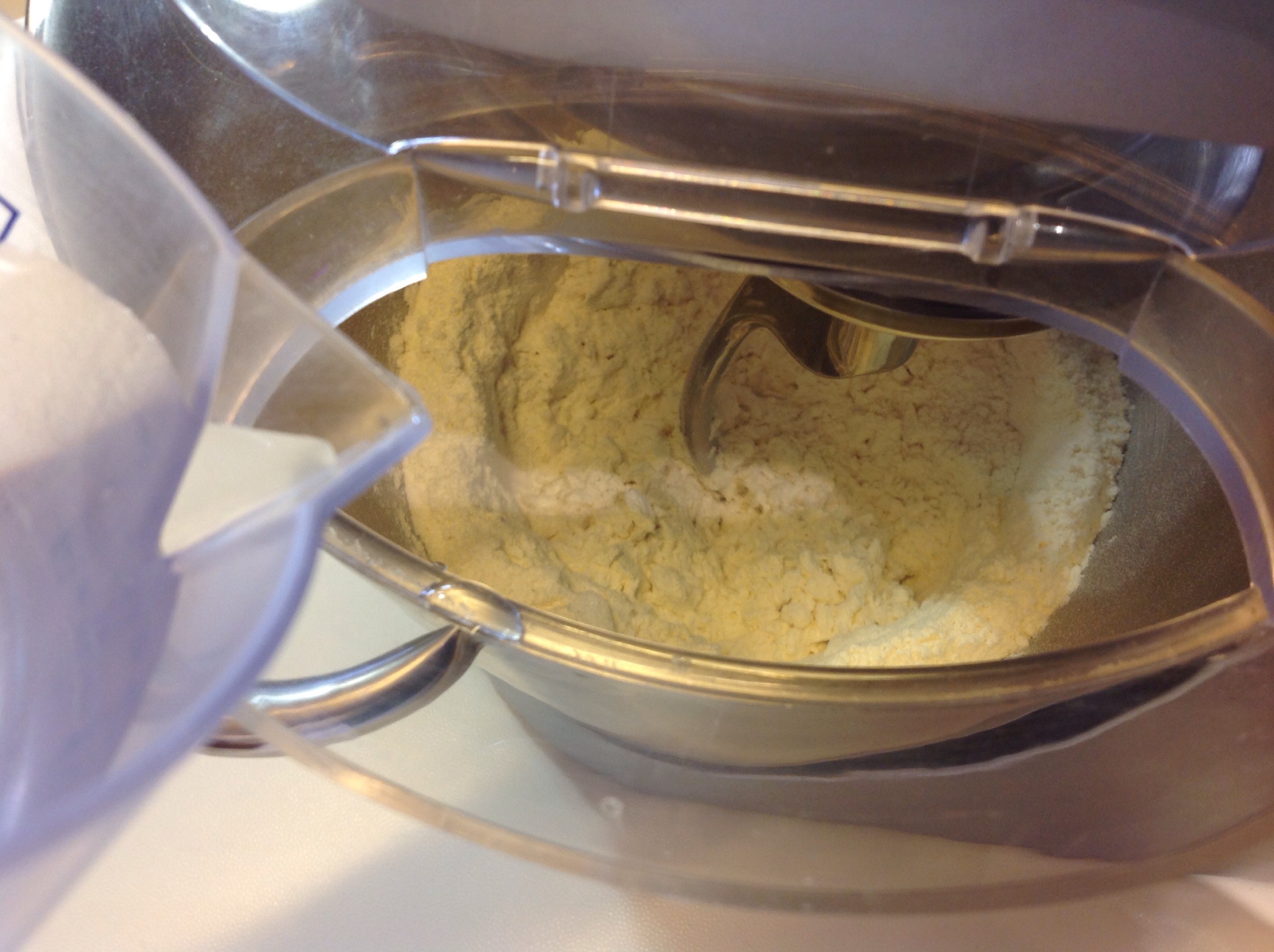 Aziono il gancio sempre a bassa velocità e inizio a versare l’acqua poca per volta perché potrebbe servirne meno o più, dipende da quanto assorbe la farina