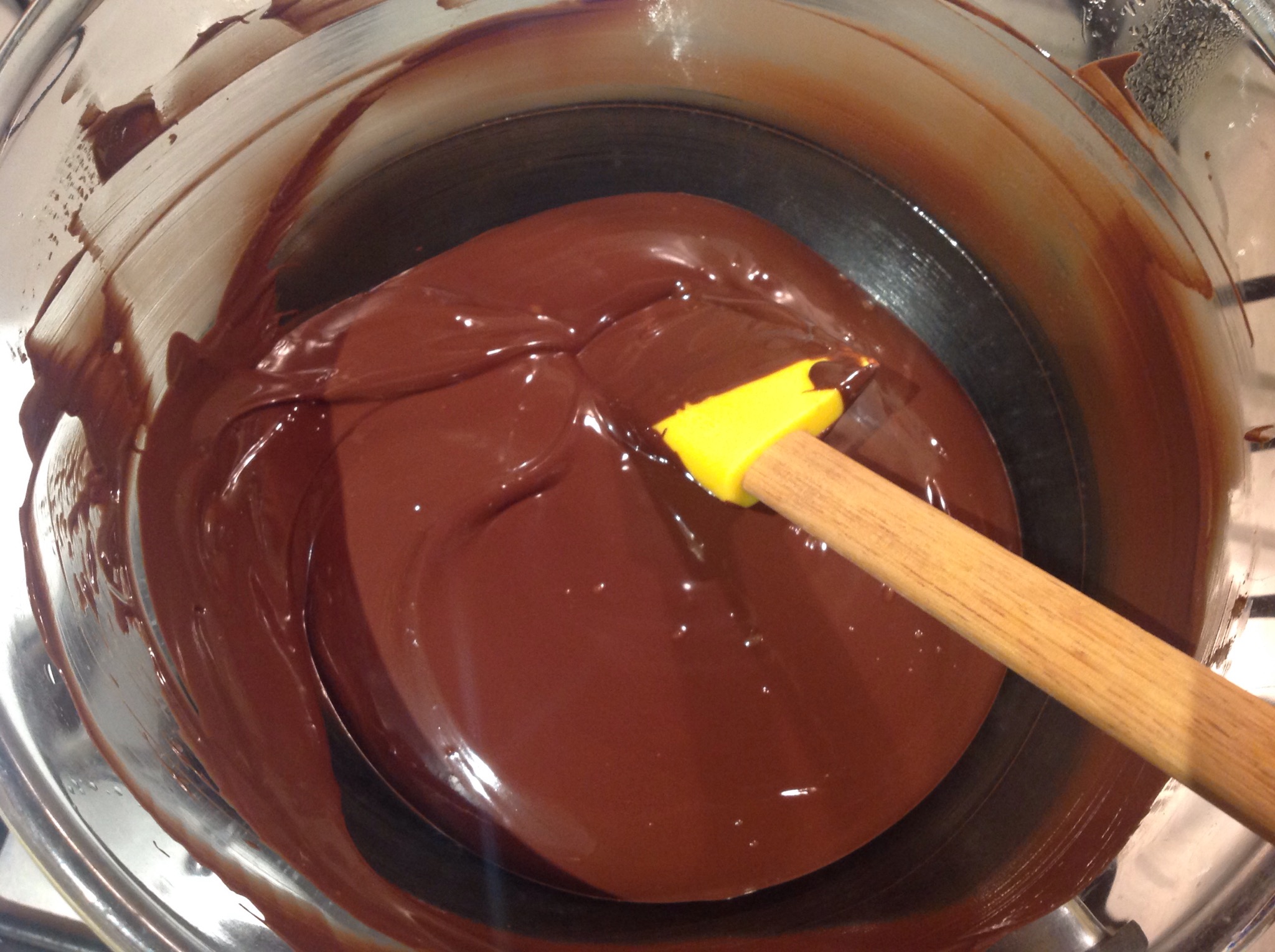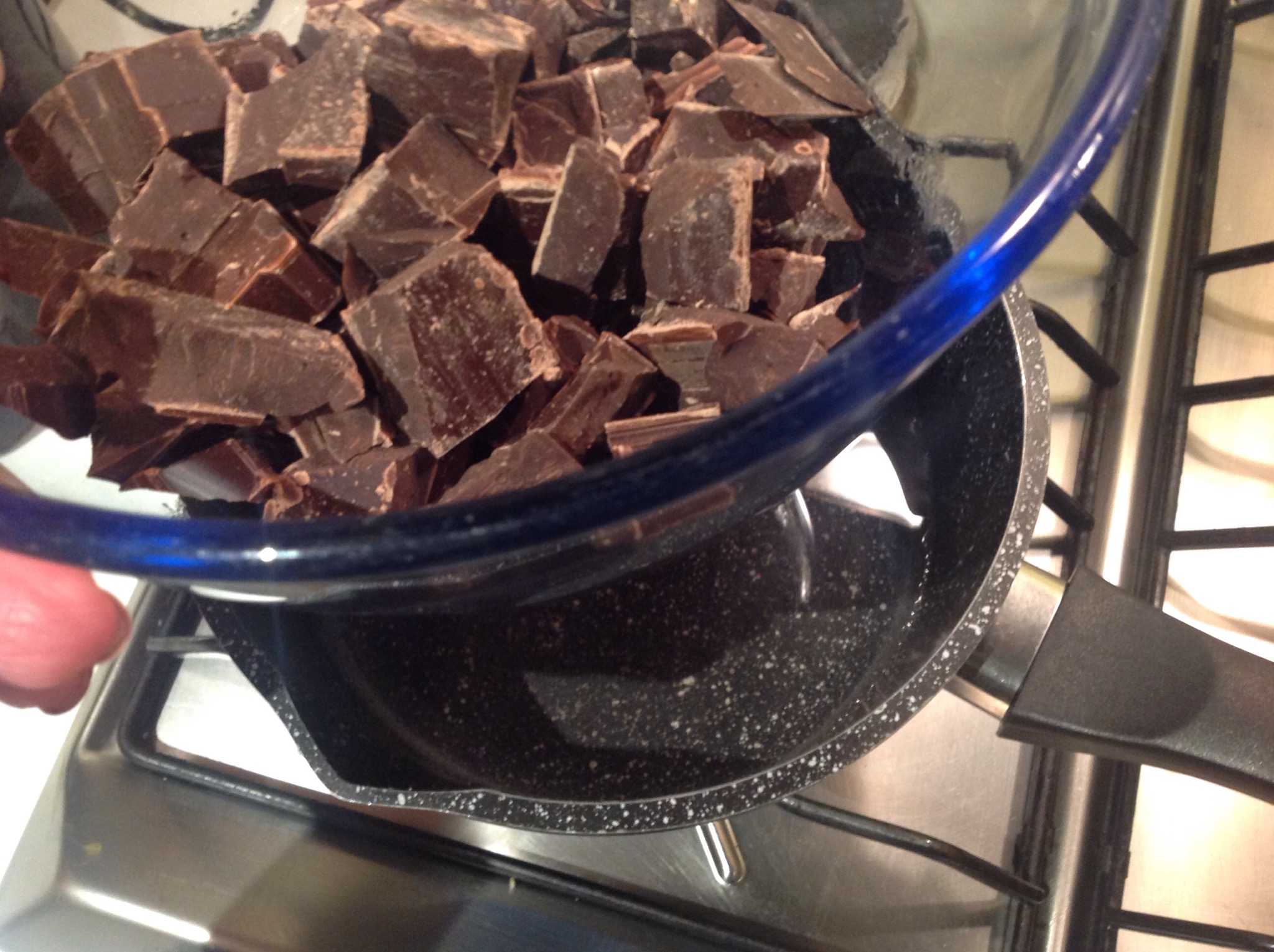 La sciolgo a bagnomaria versando il cioccolato in una ciotola che ho appoggiato sopra un pentolino in acqua in leggera ebollizione, l’acqua non deve toccare il fondo della ciotola, mescolo spesso