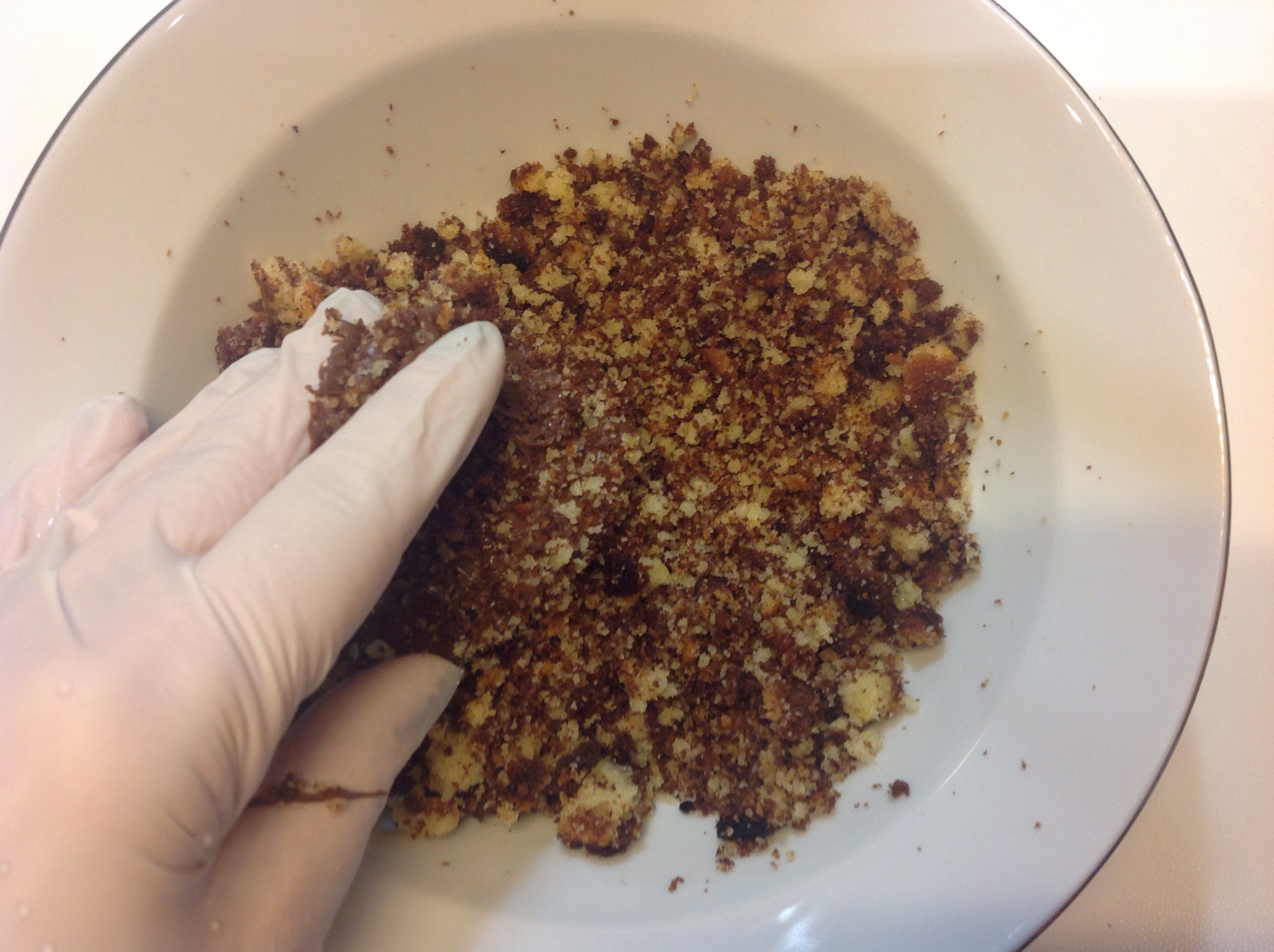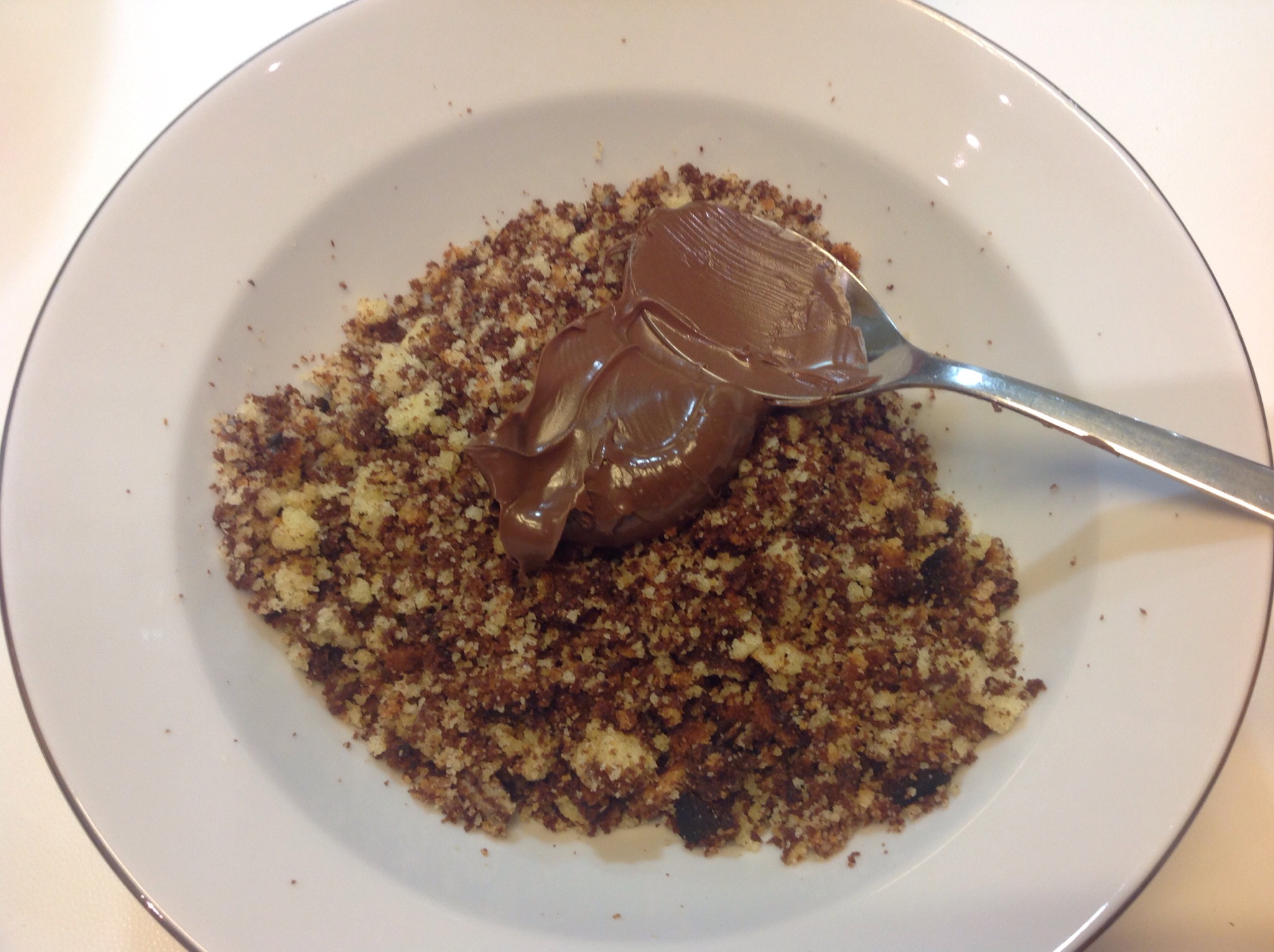 In una ciotola sbriciolo la torta e unisco un paio di cucchiai di Nutella