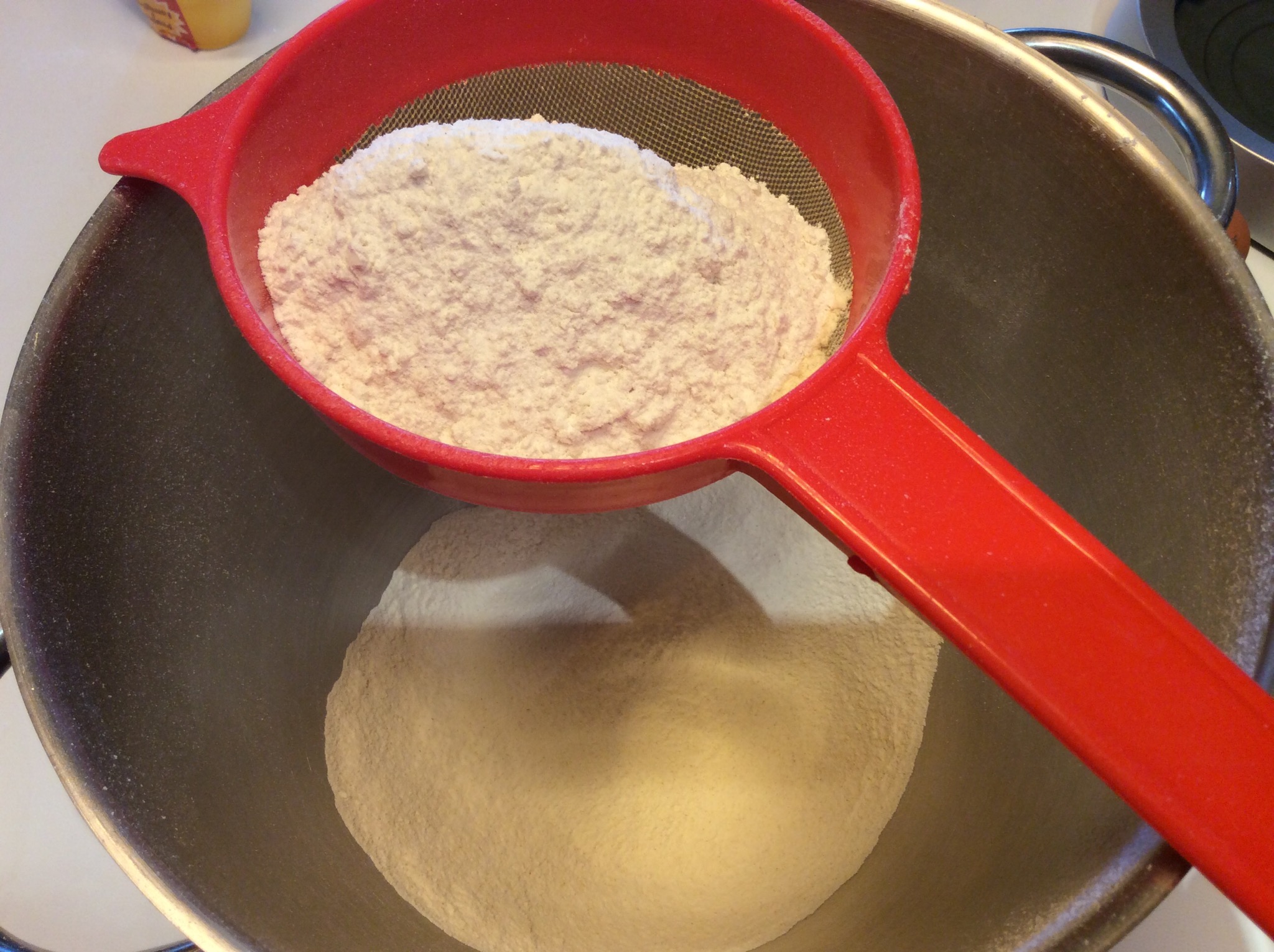 Nella ciotola dell’impastatrice setaccio la farina, è importante perché in questo modo si ossigena