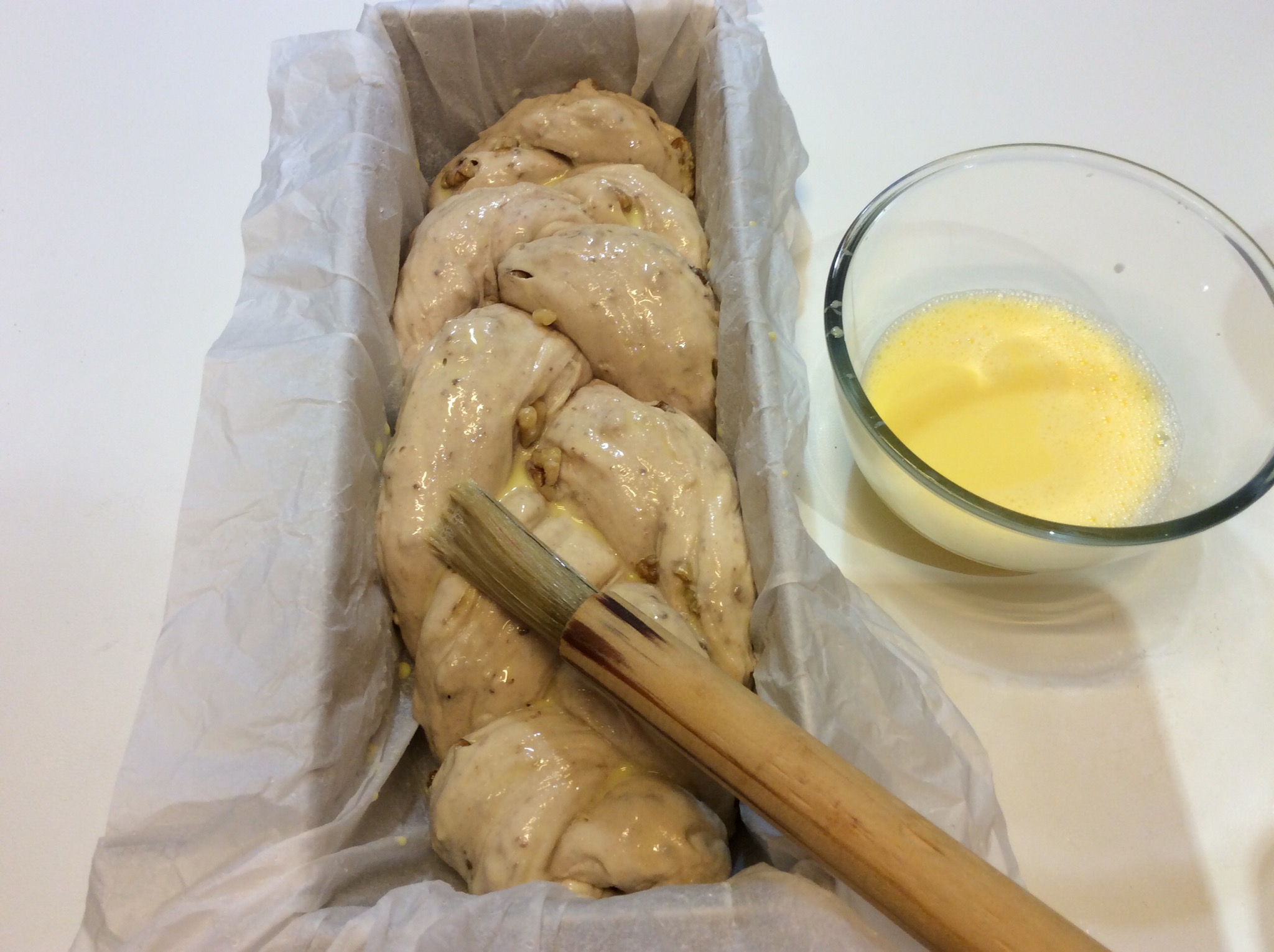 Delicatamente inserisco la treccia, se volete potete aggiungere qualche noce in superficie e la spennello con un tuorlo battuto, un goccio di latte e un pizzico di sale