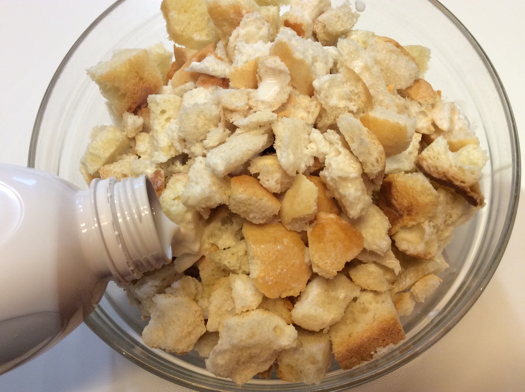 Taglio il pane a piccoli pezzi e li metto in una ciotola, verso sopra del latte, copro la ciotola con la pellicola e lascio riposare per un’ora o più finché il pane è ammorbidito