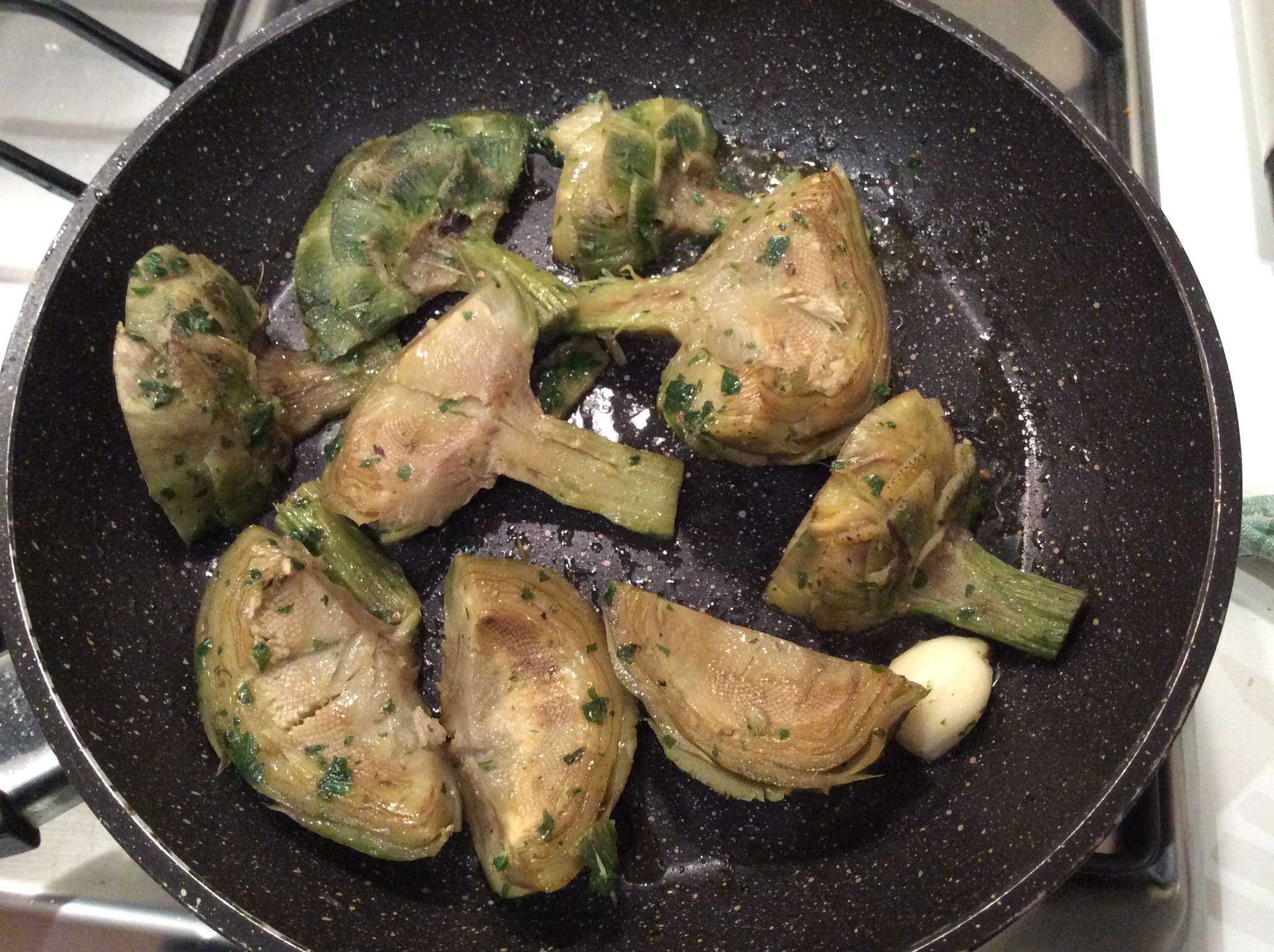 Cuocio i cuori dei carciofi che ho precedentemente pulito in una padella con olio, uno spicchio di aglio, aggiungo un goccio di acqua e porto a cottura finché diventano teneri, aggiungo poco sale e pepe e un trito di prezzemolo