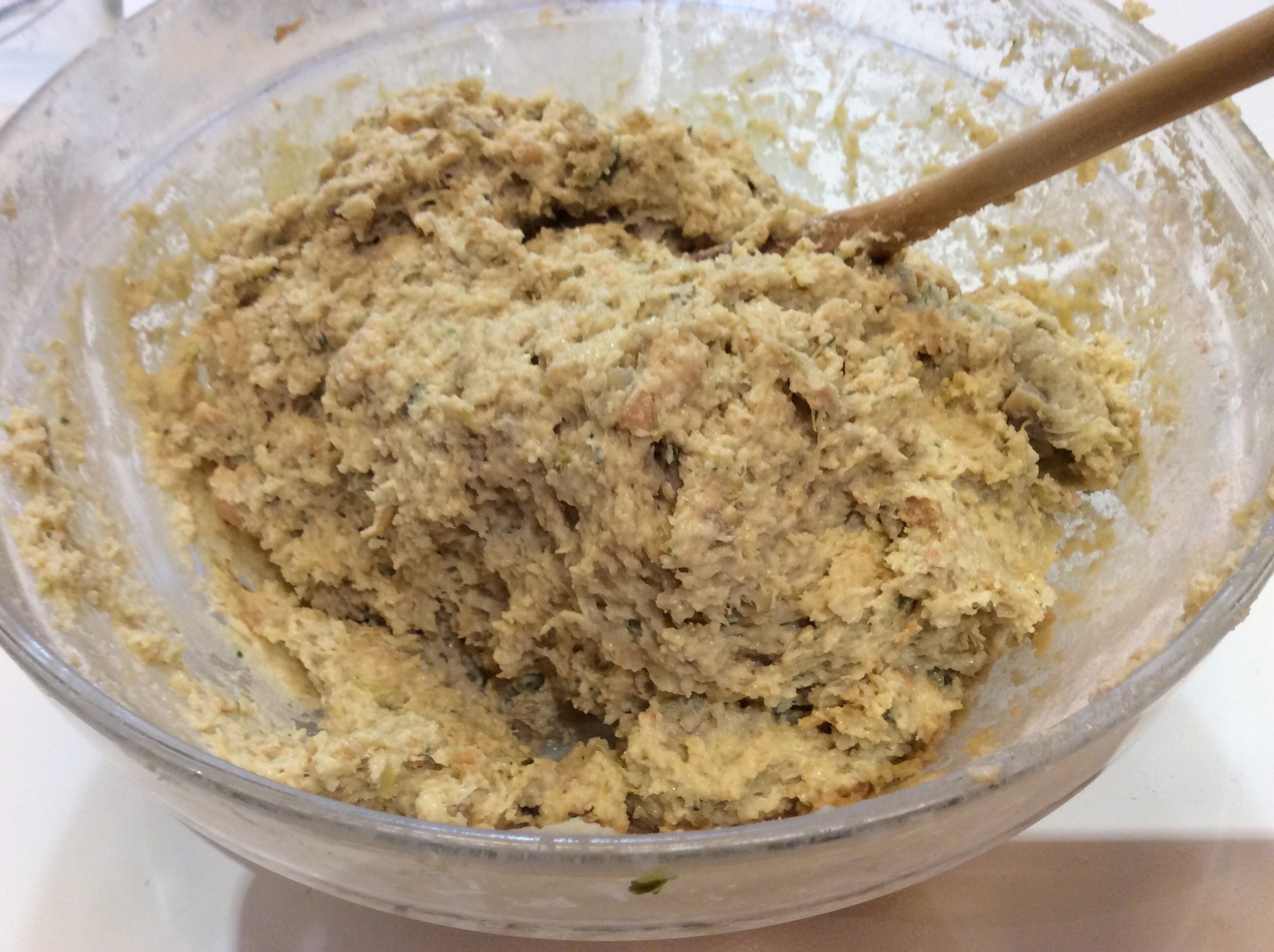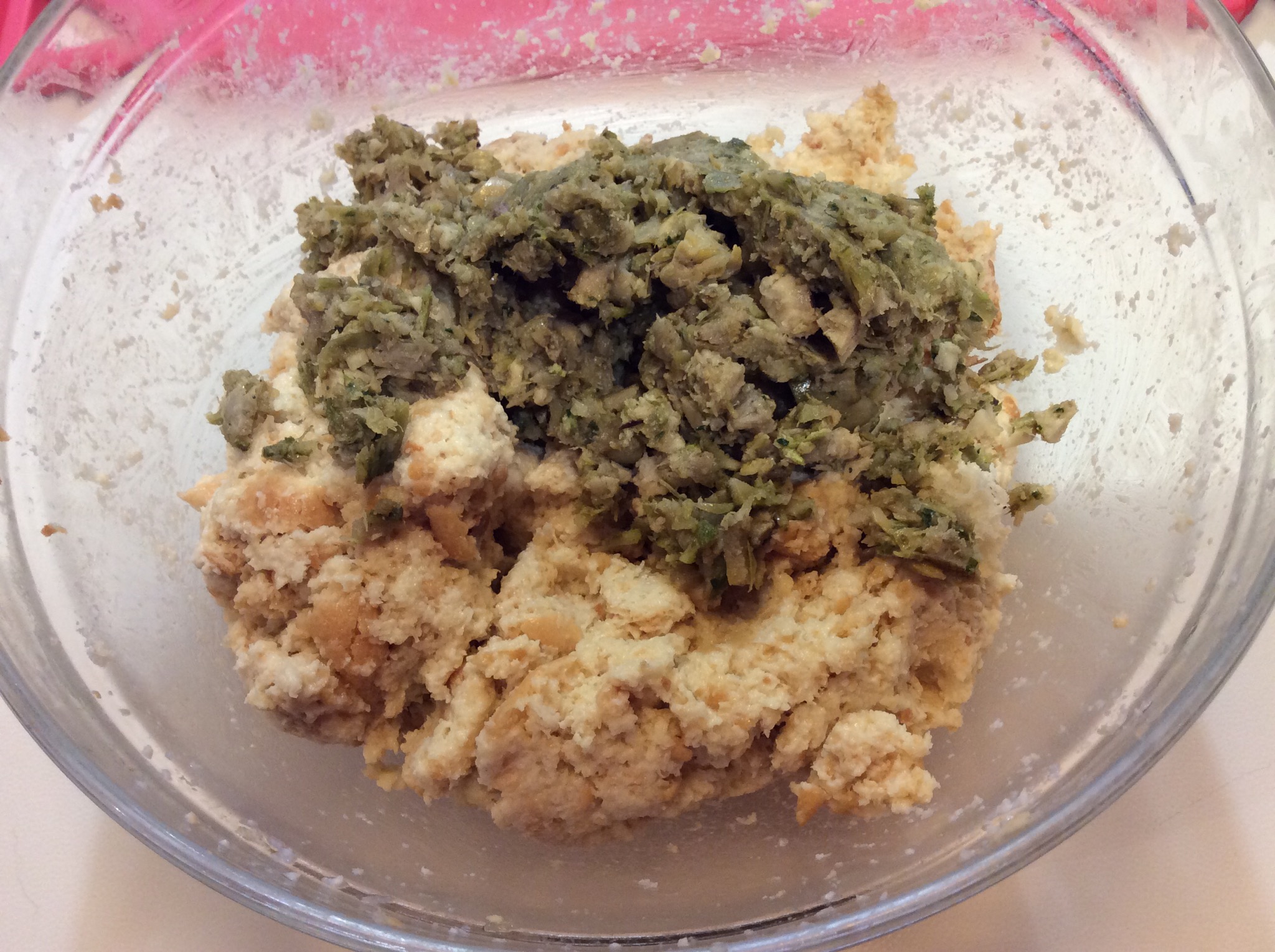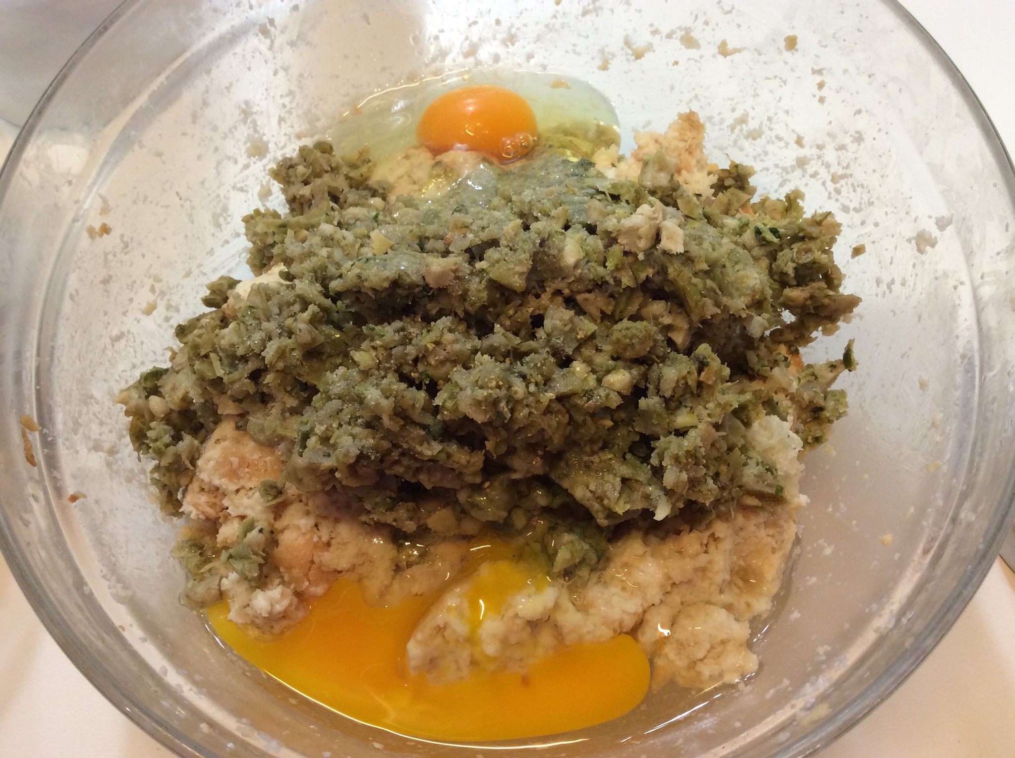 Con le mani lavoro bene il pane che è ormai morbido, devo ottenere una poltiglia, aggiungo i carciofi