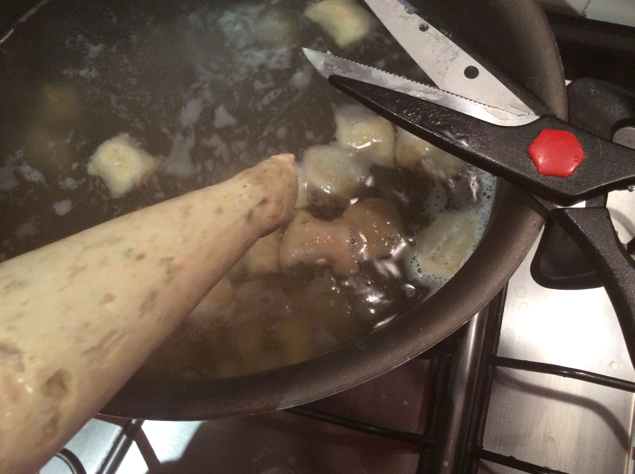 Quando l’acqua bolle aggiungo gli gnocchi tagliandoli a piccoli pezzi con una forbice