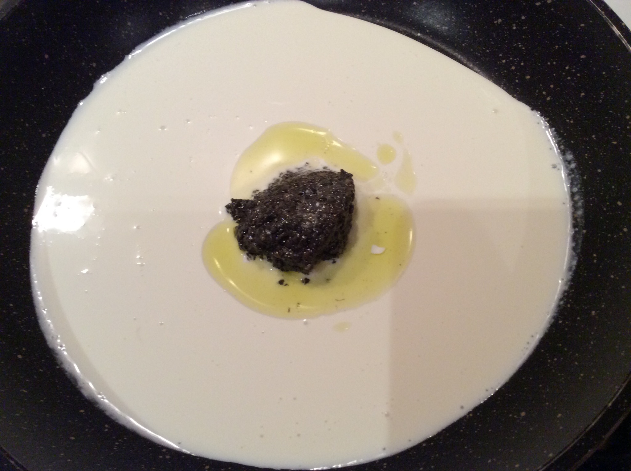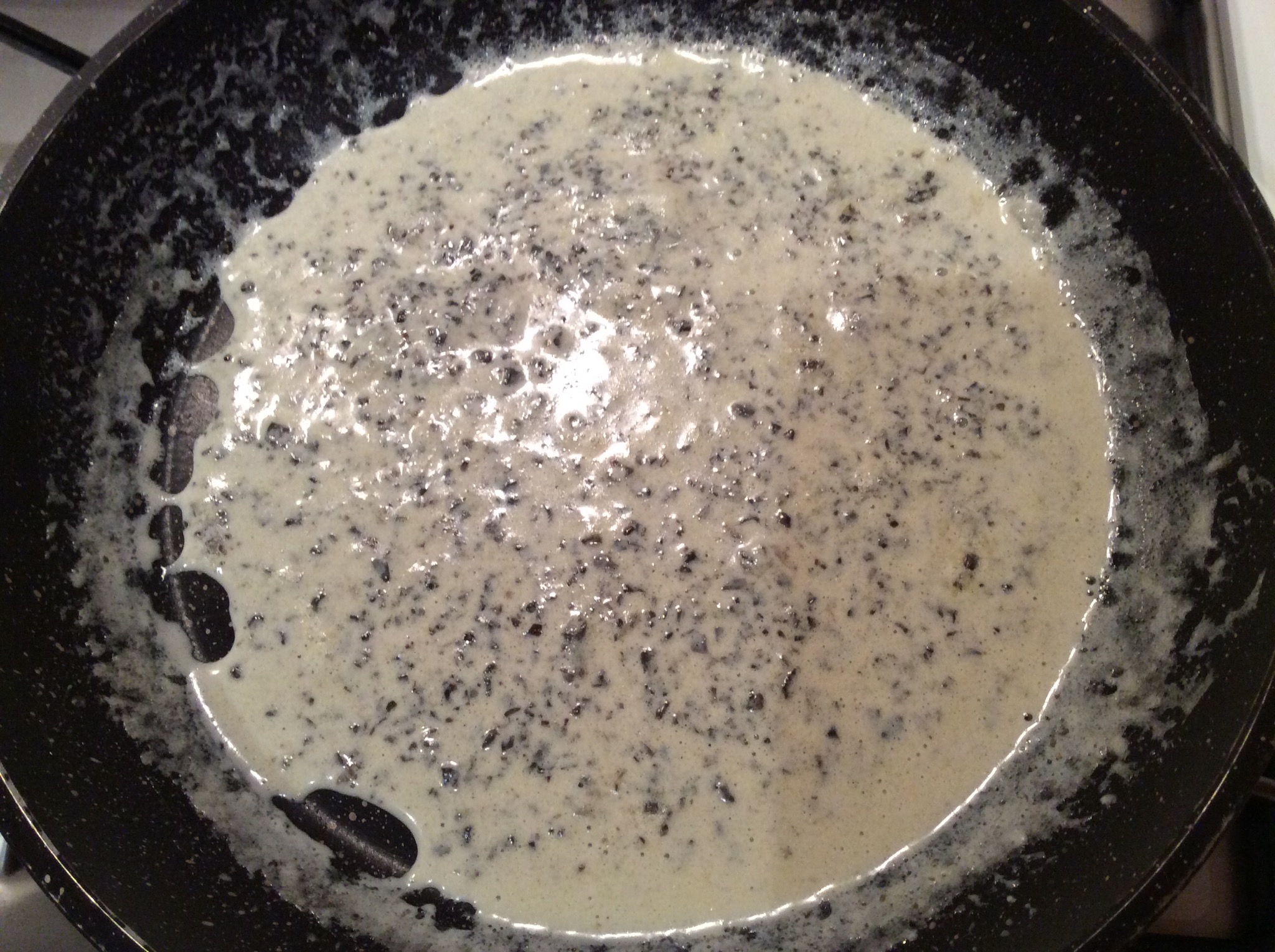In una padella antiaderente verso la panna fresca e la crema di tartufo