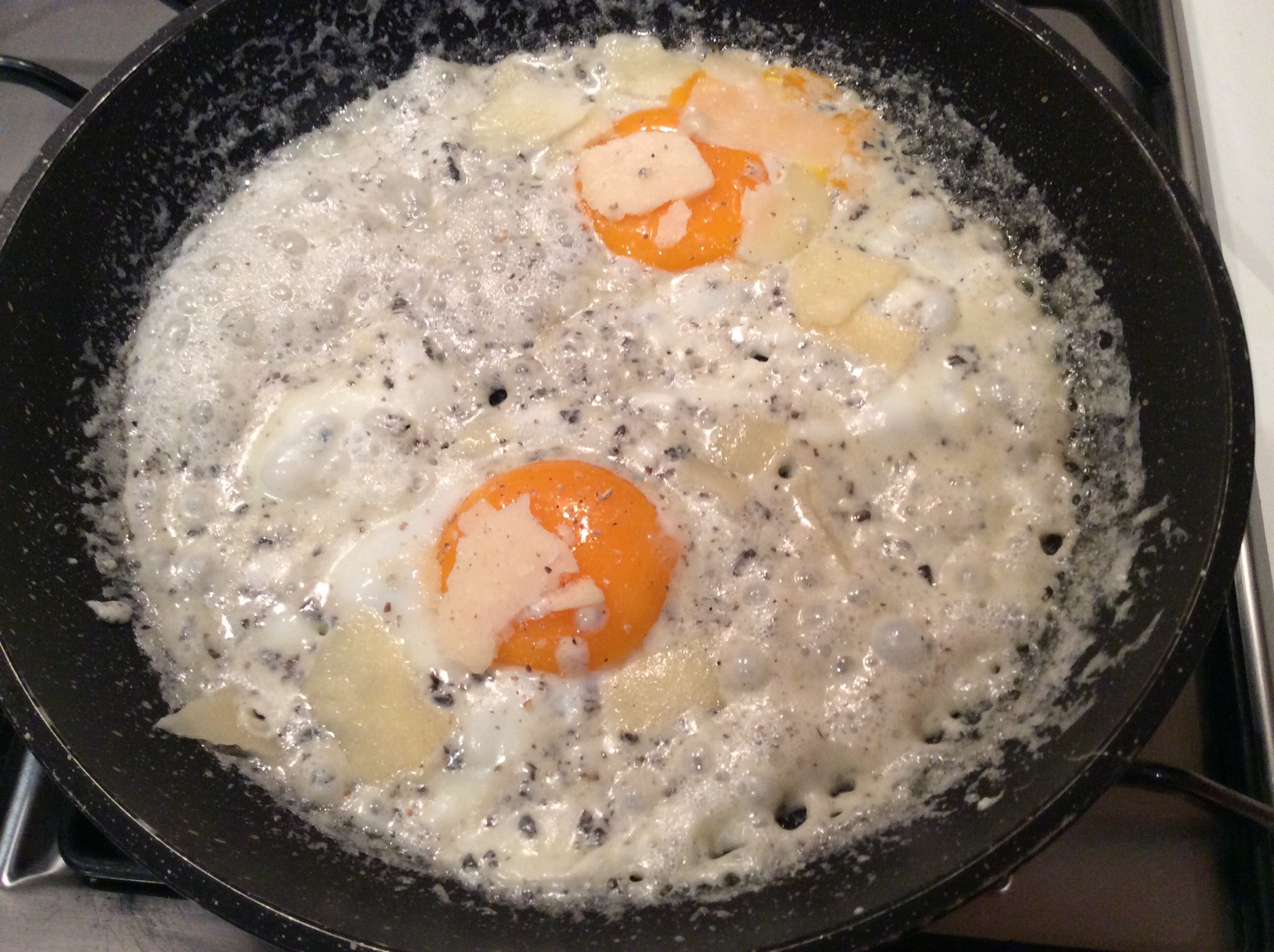 Lascio qualche minuto poi aggiungo poco sale e pepe alcune scaglie di parmigiano e copro con un coperchio per due minuti poi spengo