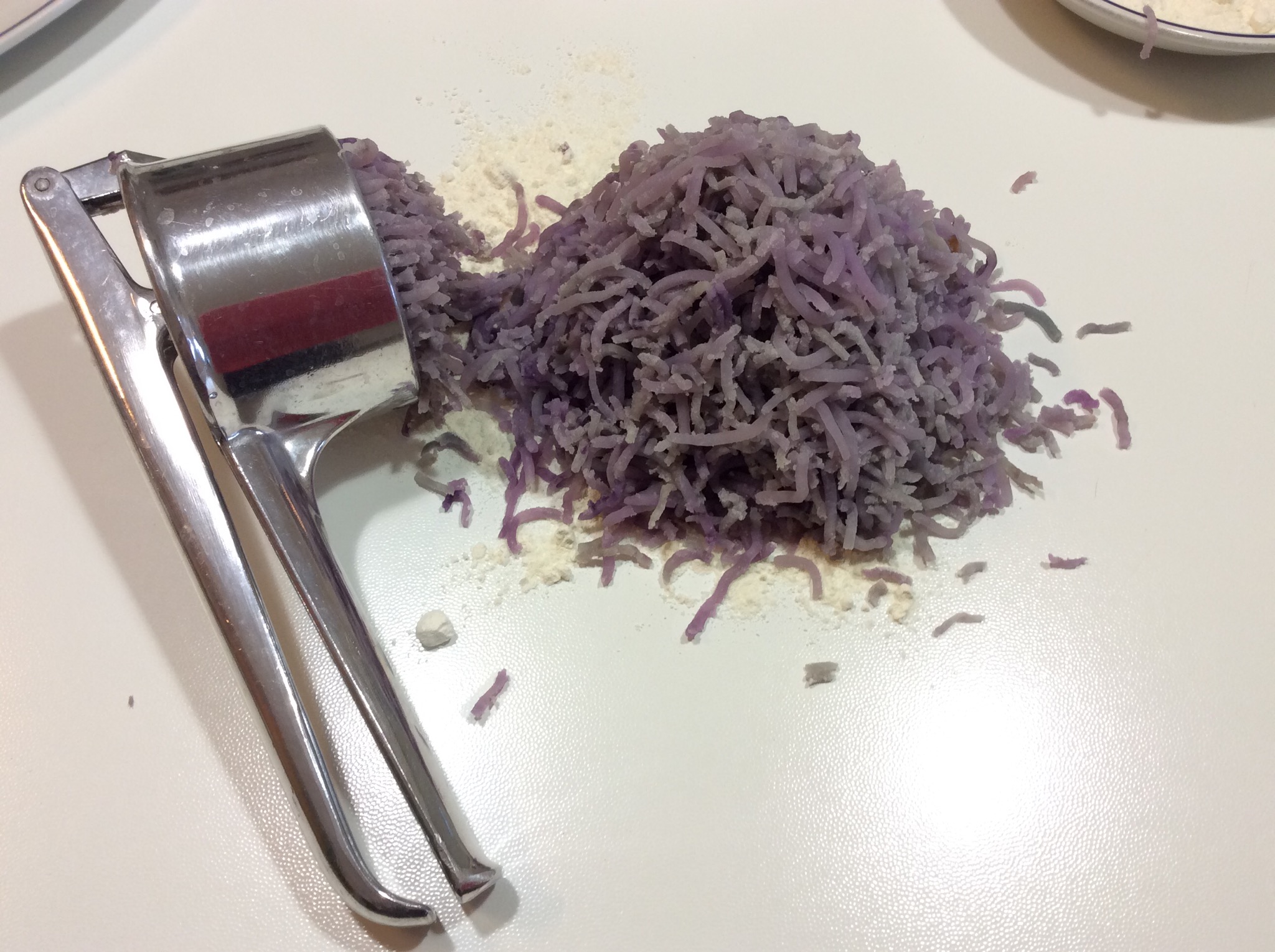 Le schiaccio con uno schiacciapatate sulla spianatoia