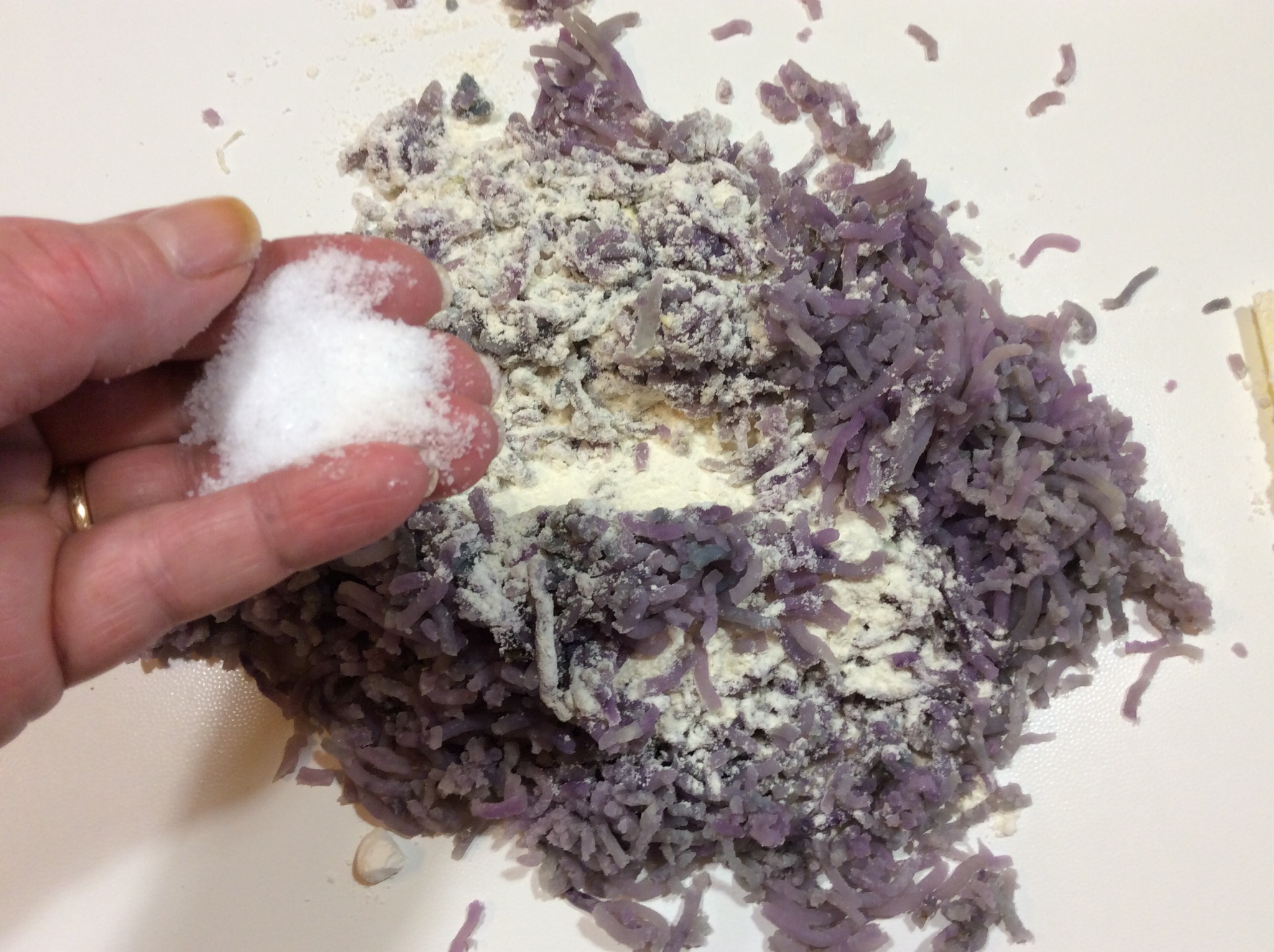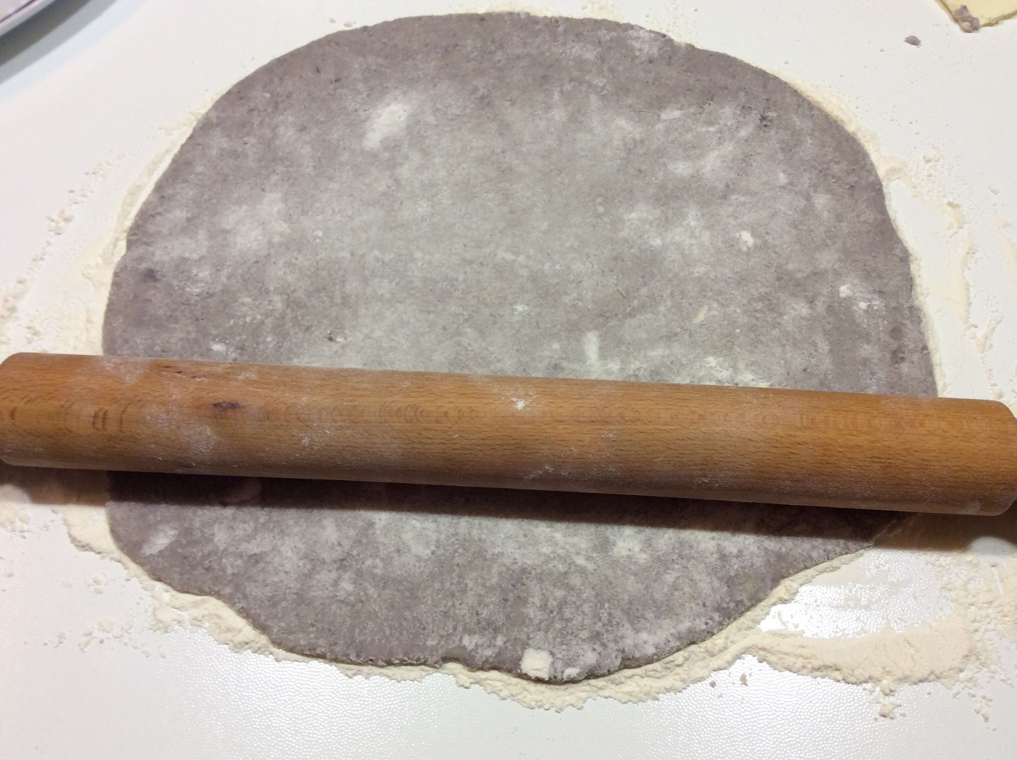 Infarino abbondantemente la spianatoia e stendo con un matterello l’impasto dello spessore di circa mezzo cm
