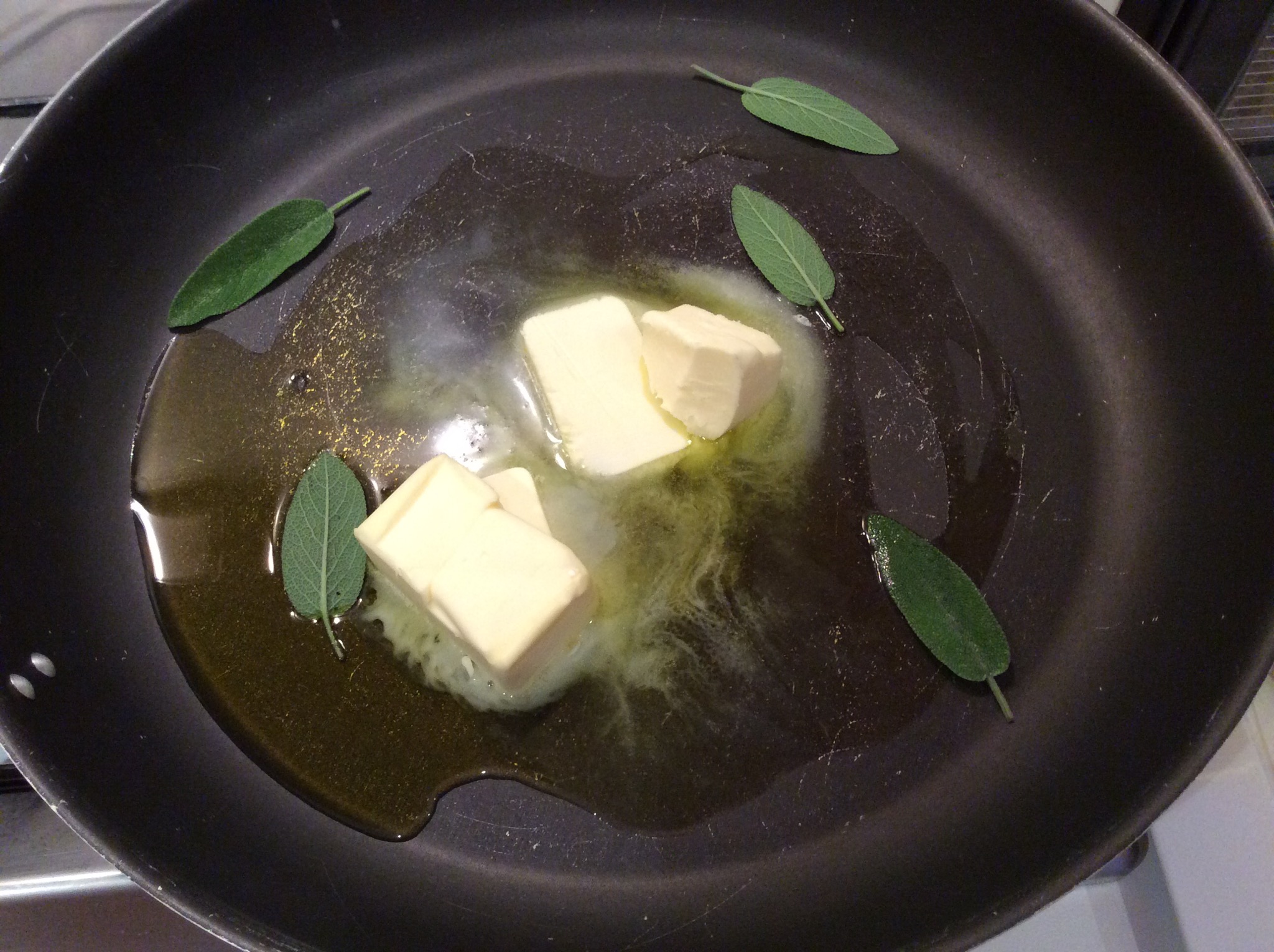 In una larga padella verso il burro, un po’ di olio extravergine, la salvia e li sciolgo senza farli friggere