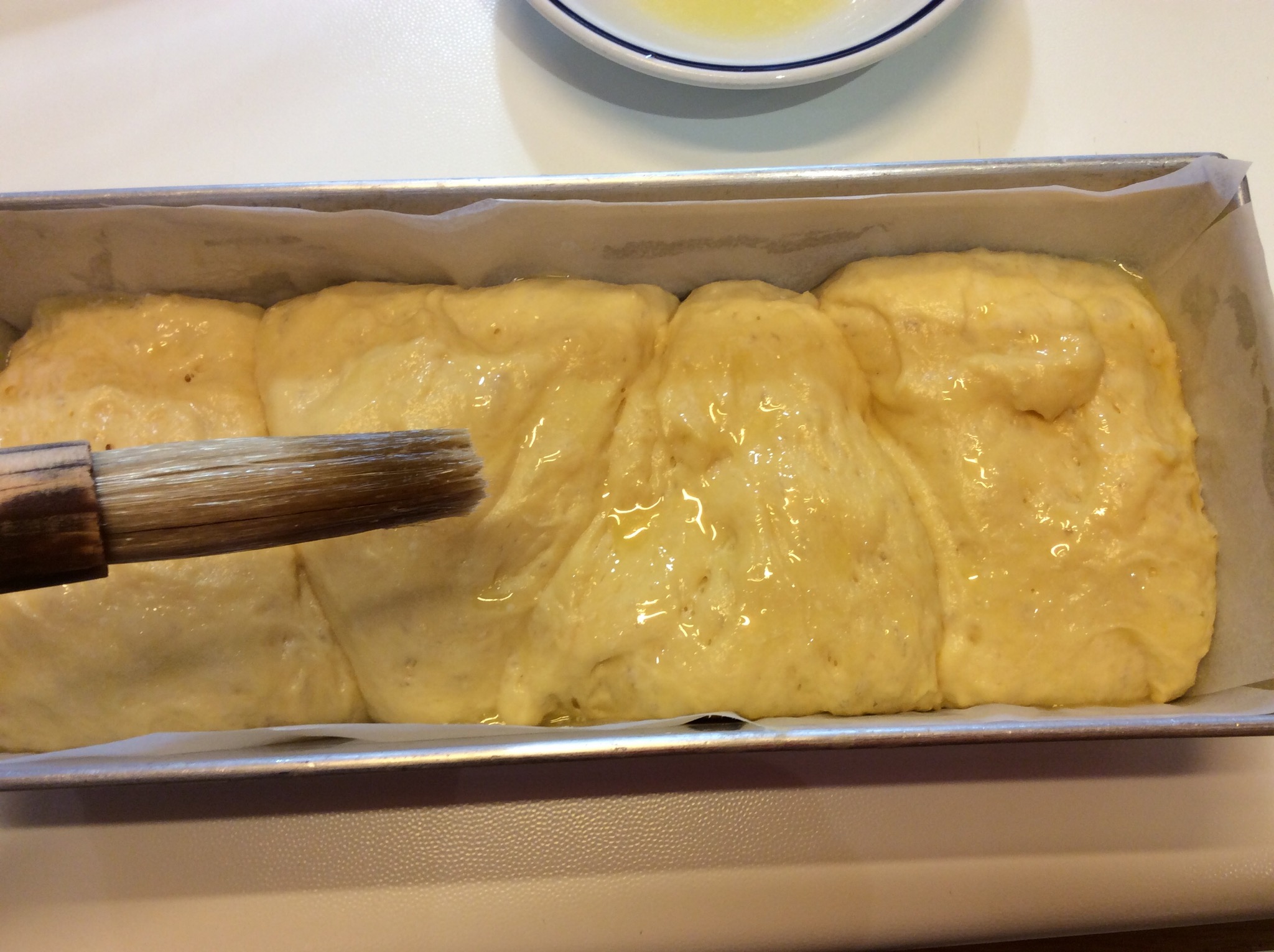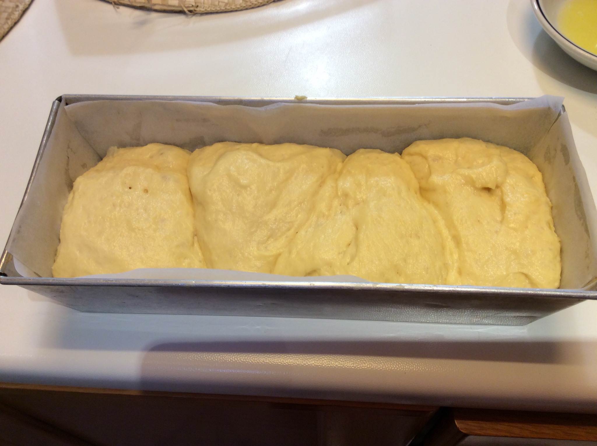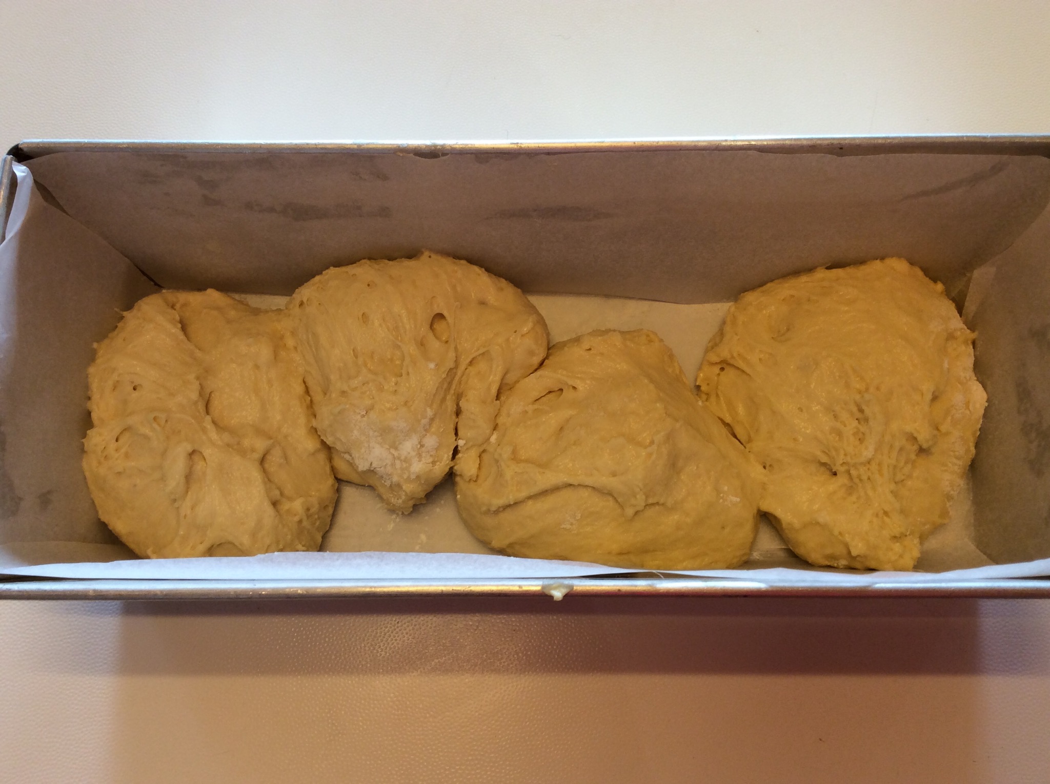 Risulterà un po’ appiccicosa, con una spatola infarinata la divido in 4 parti uguali che sistemo sfalsati in uno stampo da plumcake 30×11 cm circa rivestito con carta forno o imburrato e infarinato