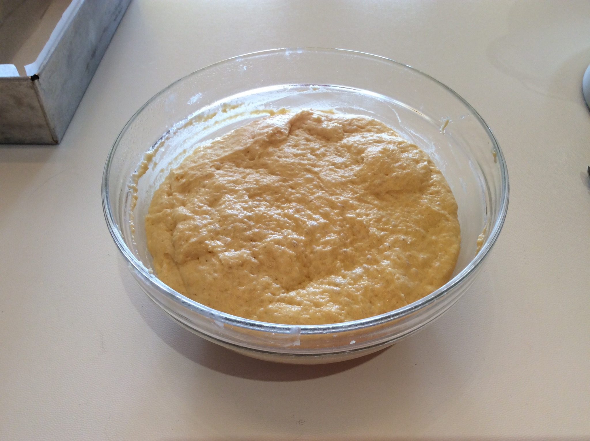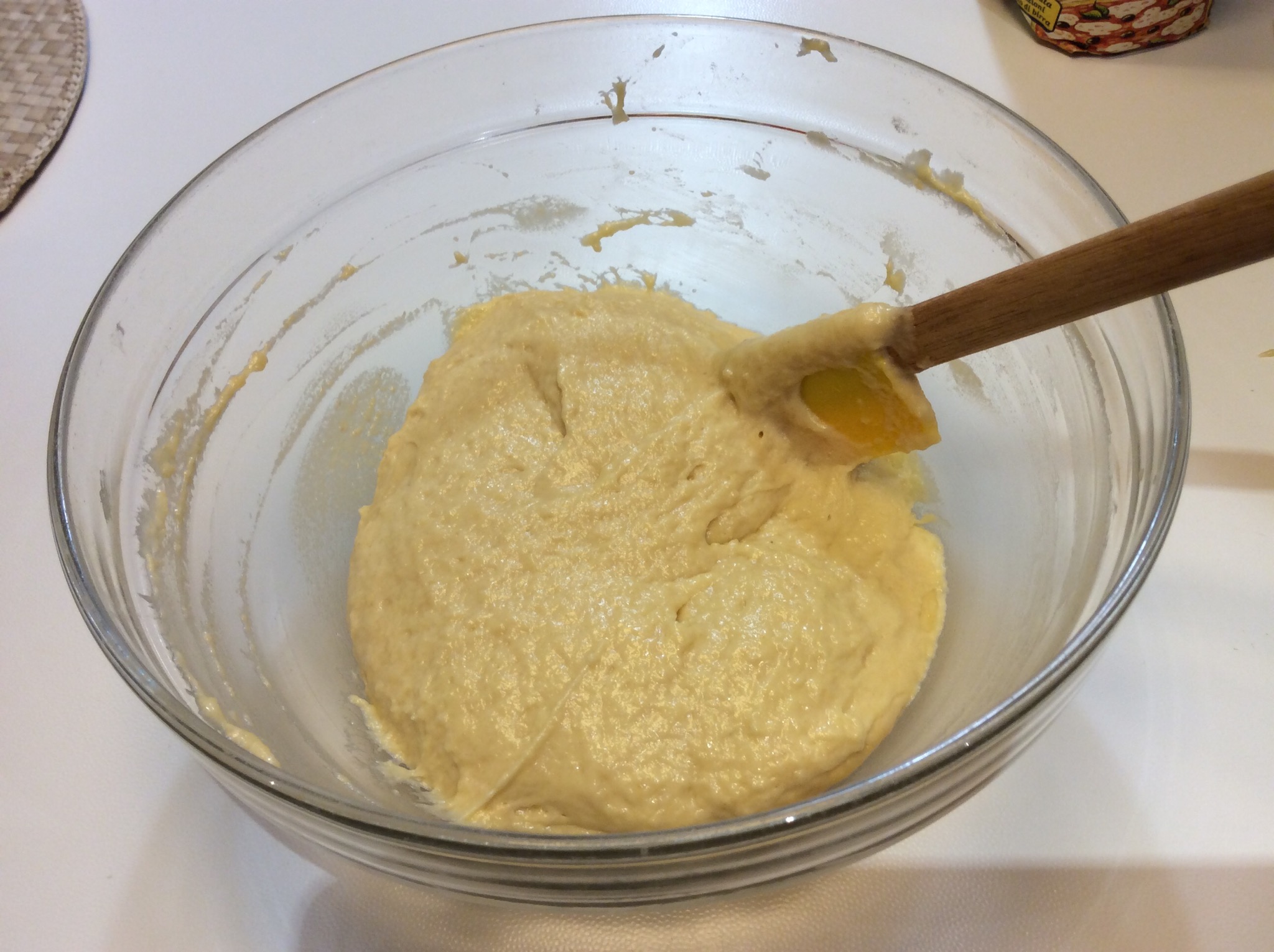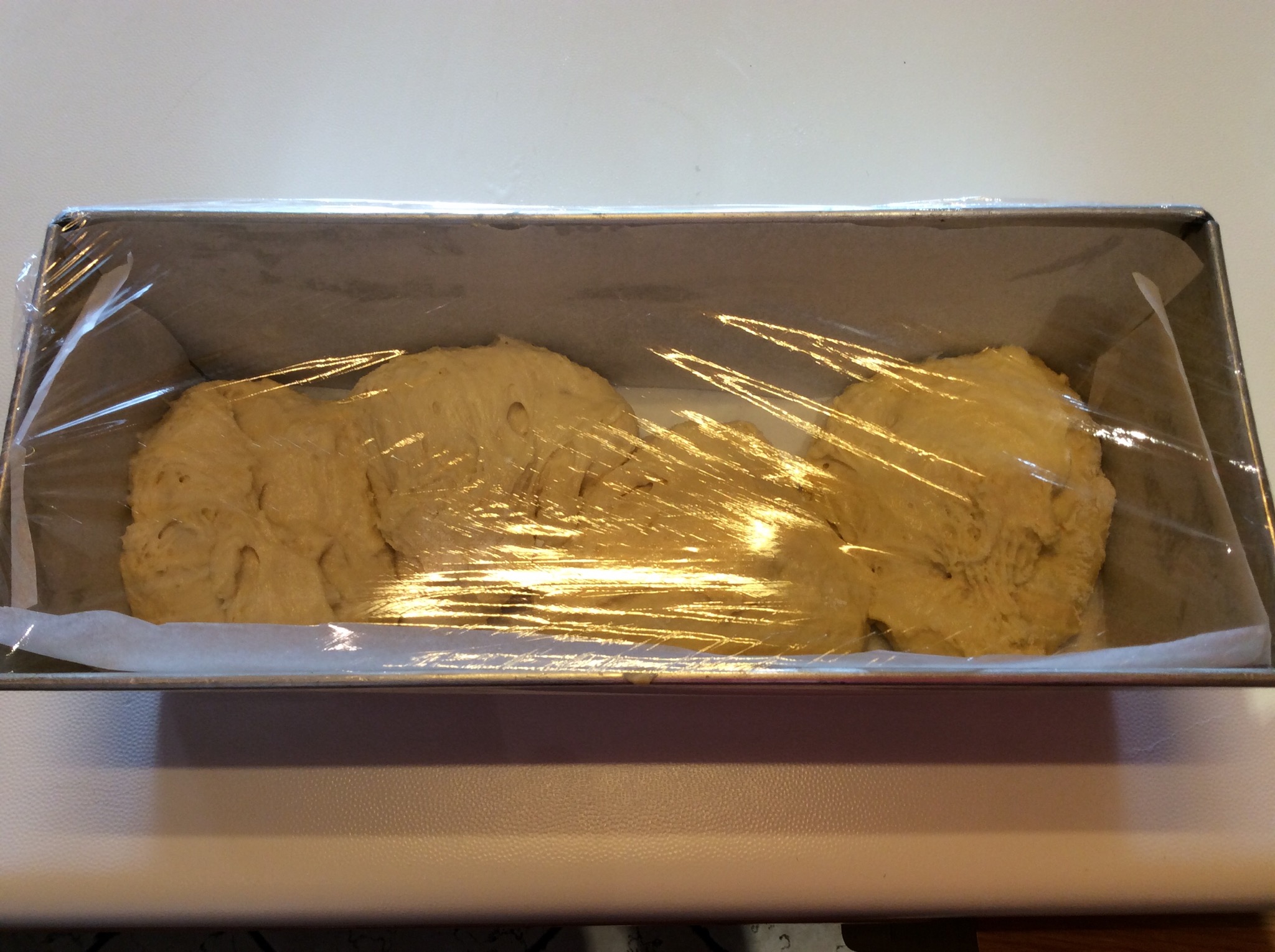 Risulterà un po’ appiccicosa, con una spatola infarinata la divido in 4 parti uguali che sistemo sfalsati in uno stampo da plumcake 30×11 cm circa rivestito con carta forno o imburrato e infarinato