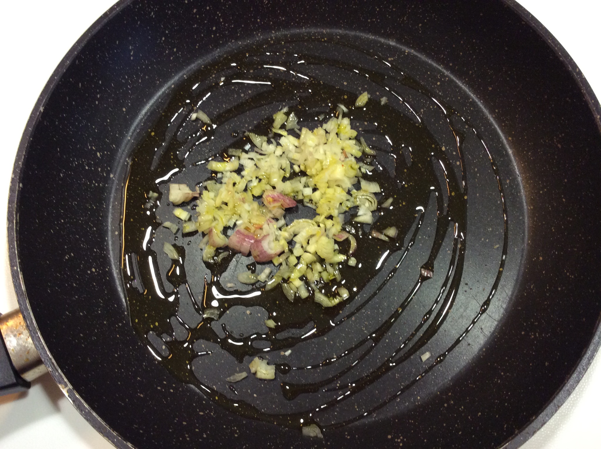 In una padella scaldo dell’olio extravergine, e lo scalogno tritato