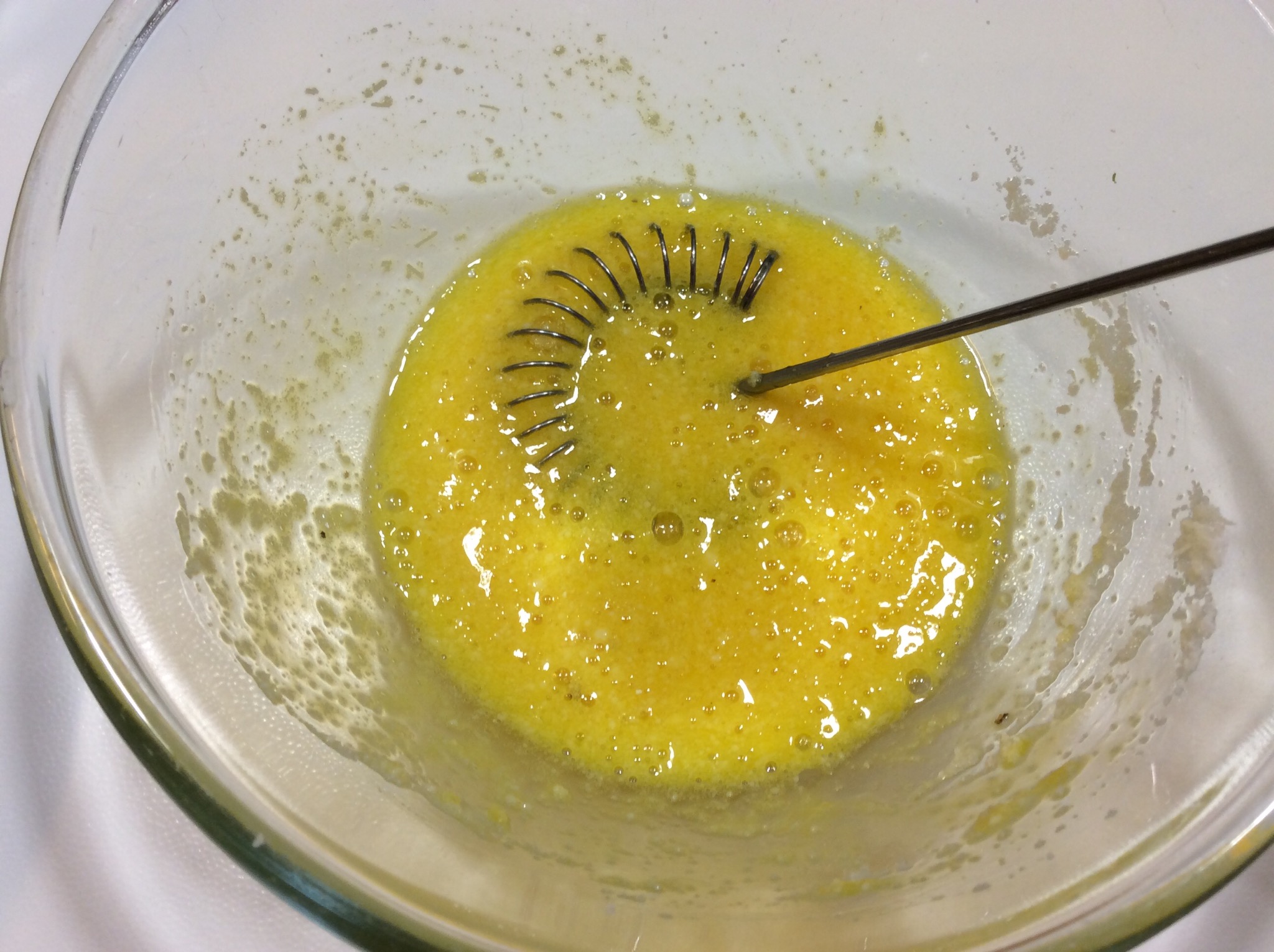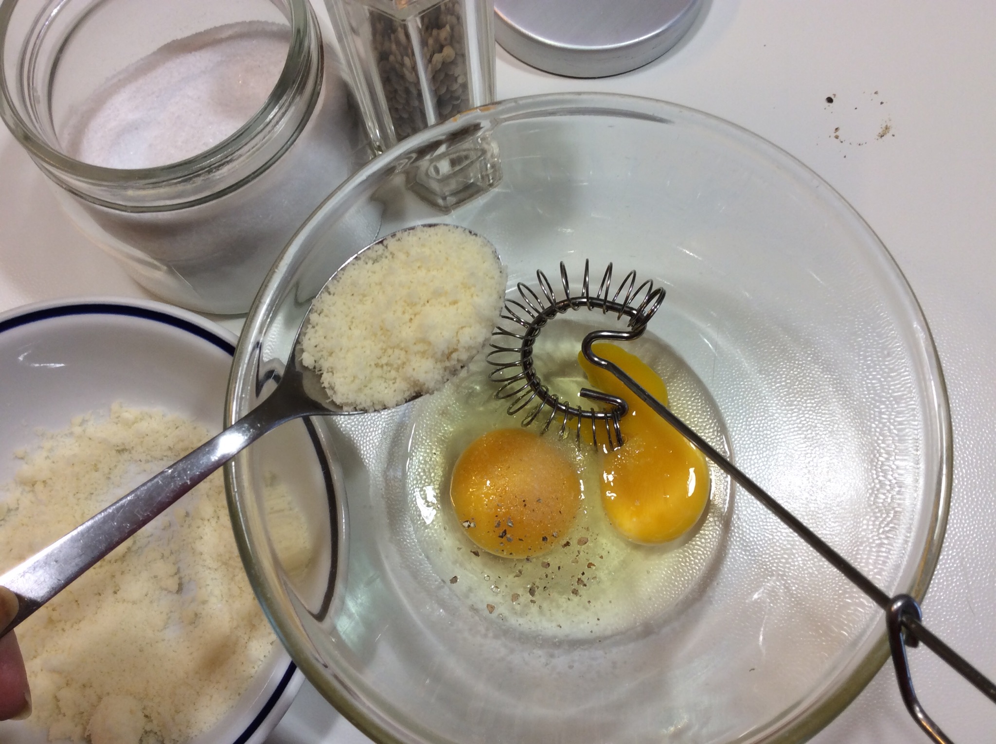 Nel frattempo in una ciotola rompo le uova, aggiungo il parmigiano, sale e pepe e lavoro con una frustina