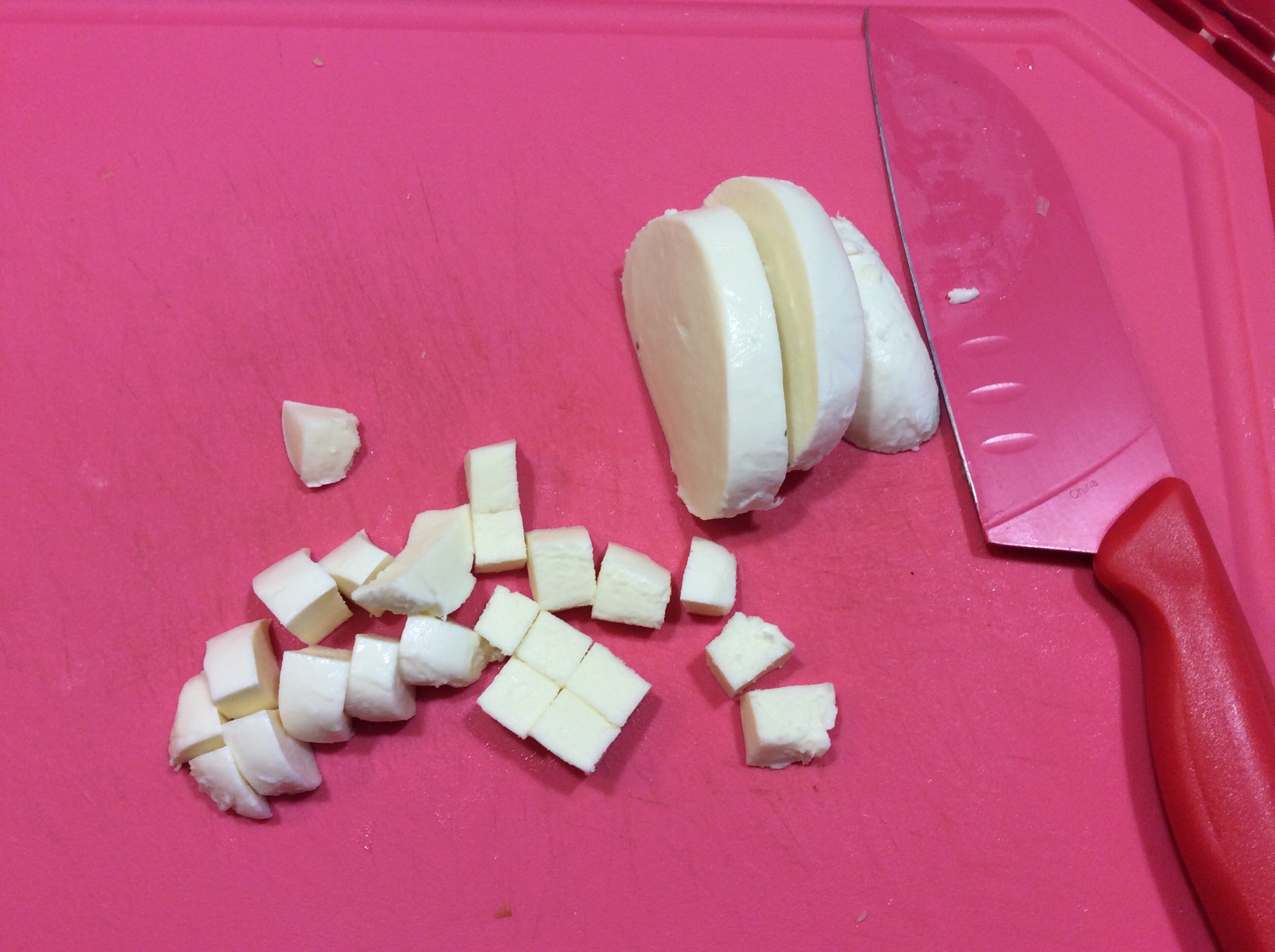 Affetto una mozzarella a cubetti e la lascio asciugare su un foglio di carta assorbente