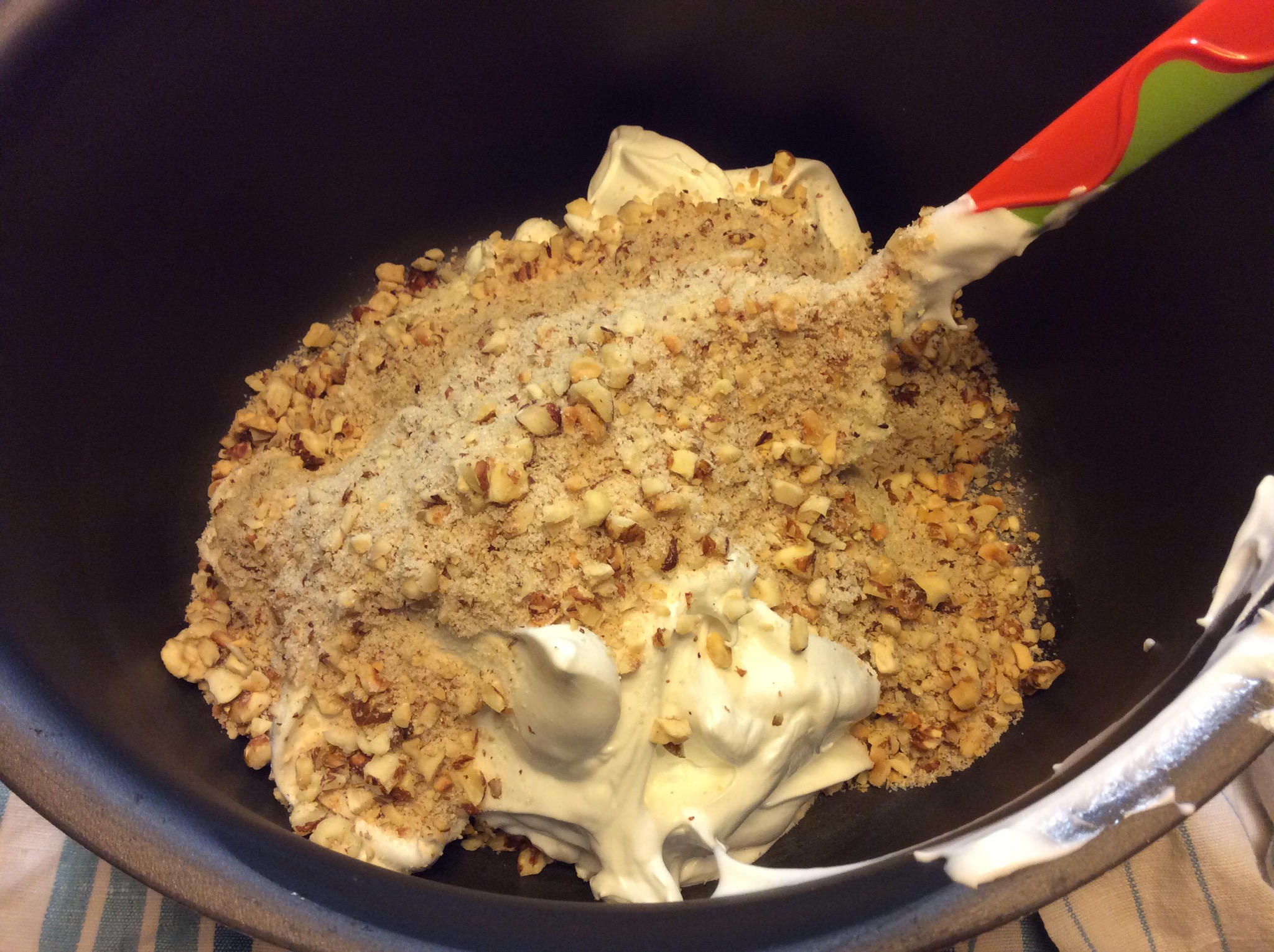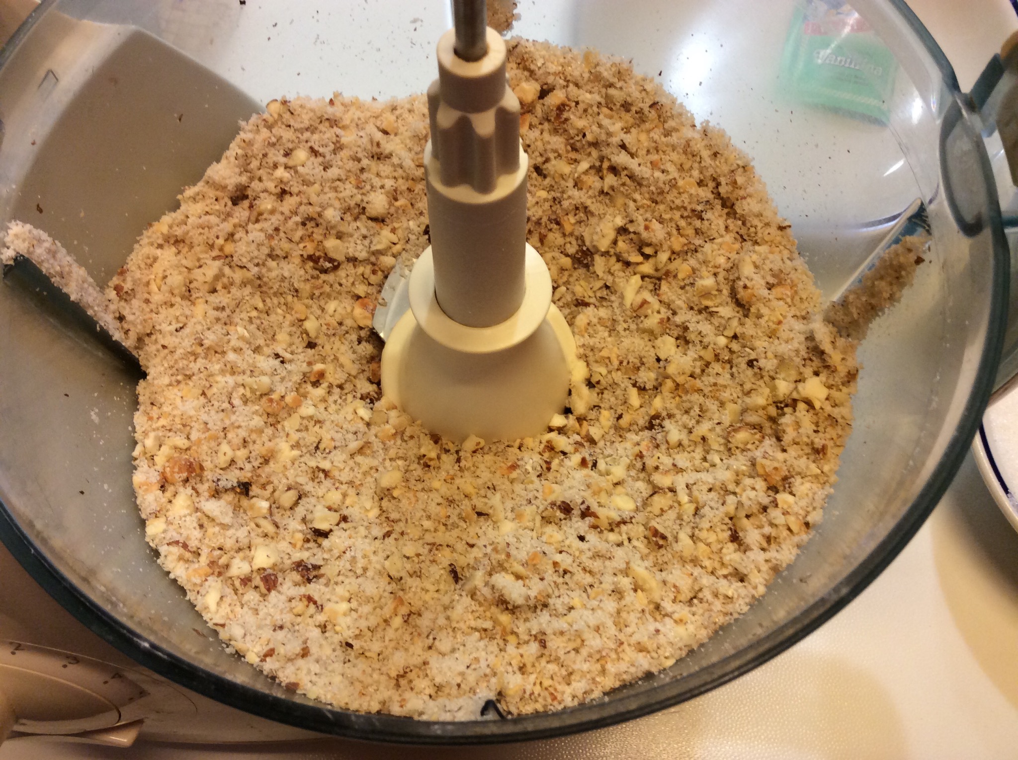 Aziono il mixer ad intermittenza per non scaldare troppo il composto, lascio le nocciole tritate grossolanamente