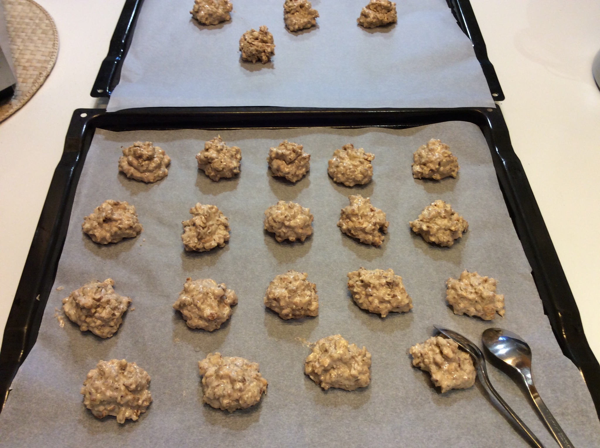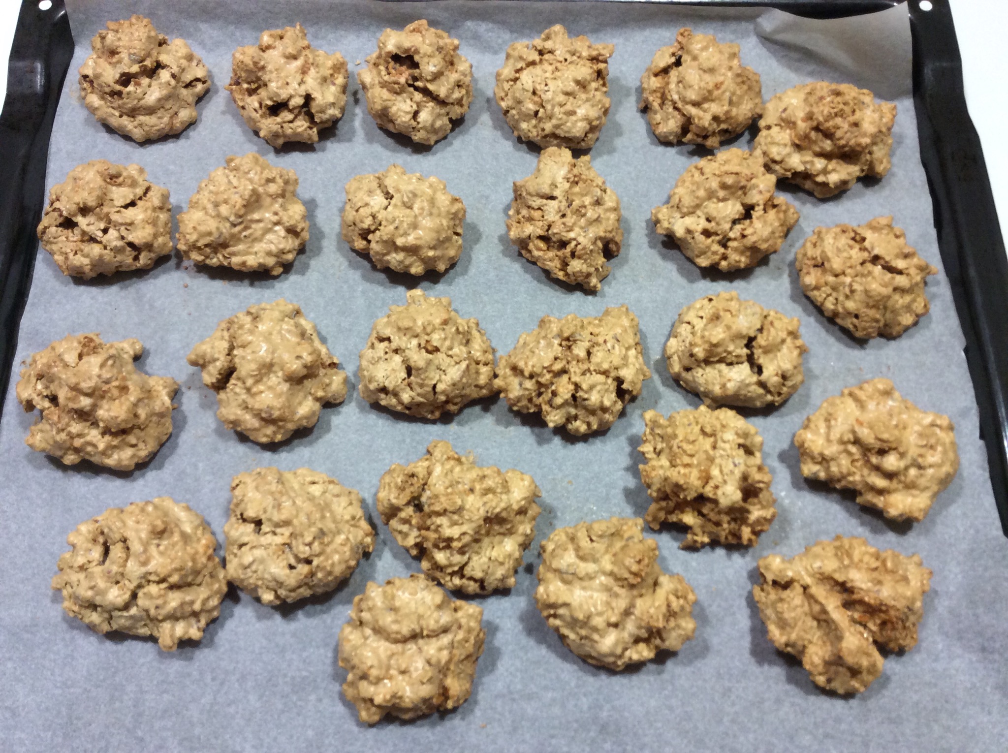 Preparo la teglia ricoperta di carta forno e aiutandomi con due cucchiaini formo dei mucchietti leggermente distanziati, fate velocemente perché raffreddandosi il composto indurisce