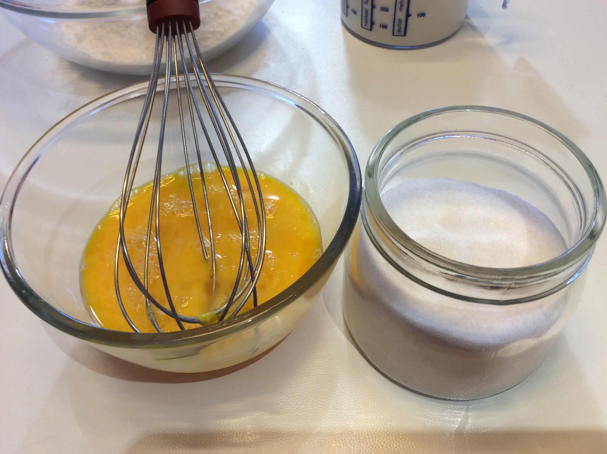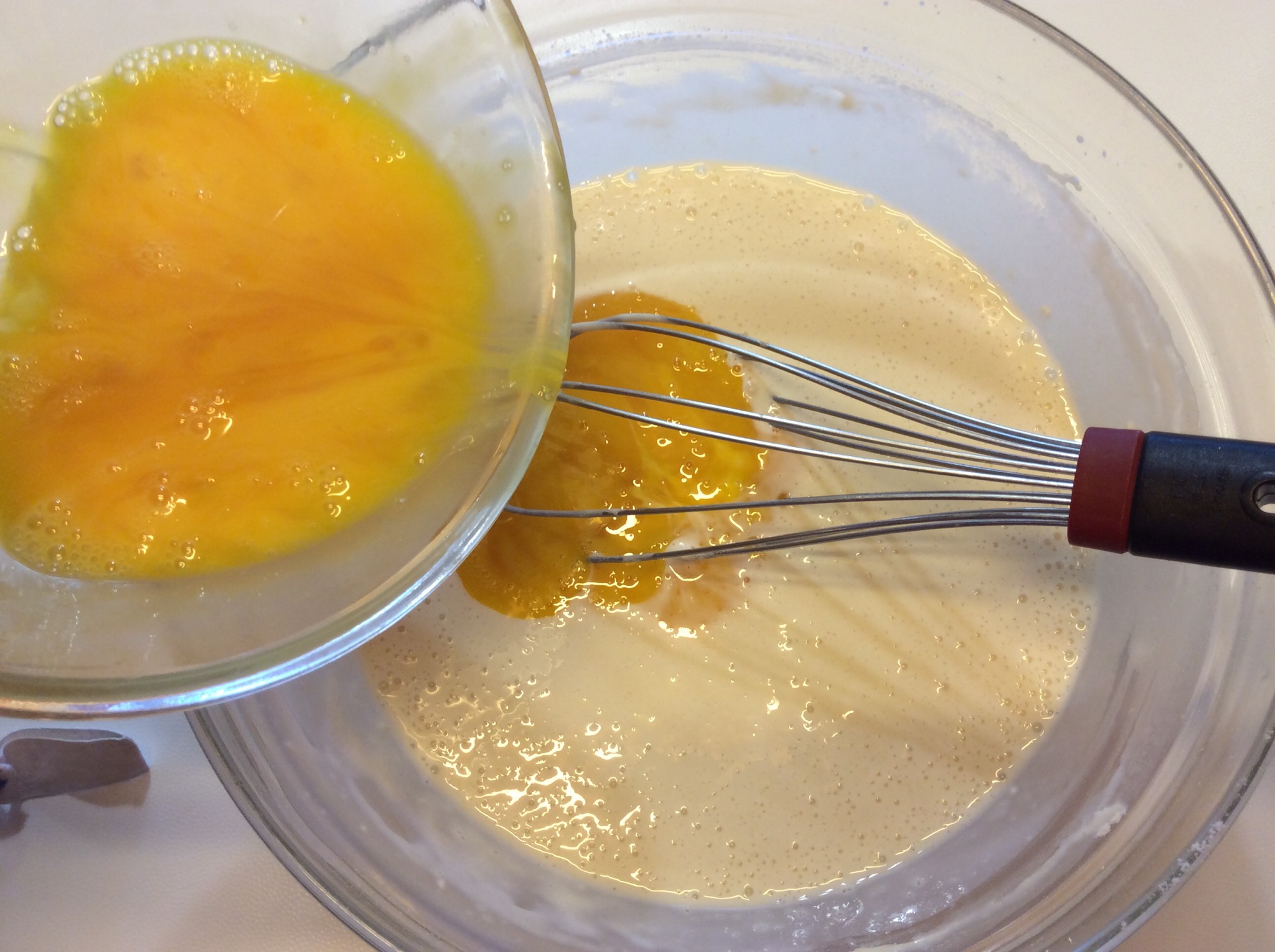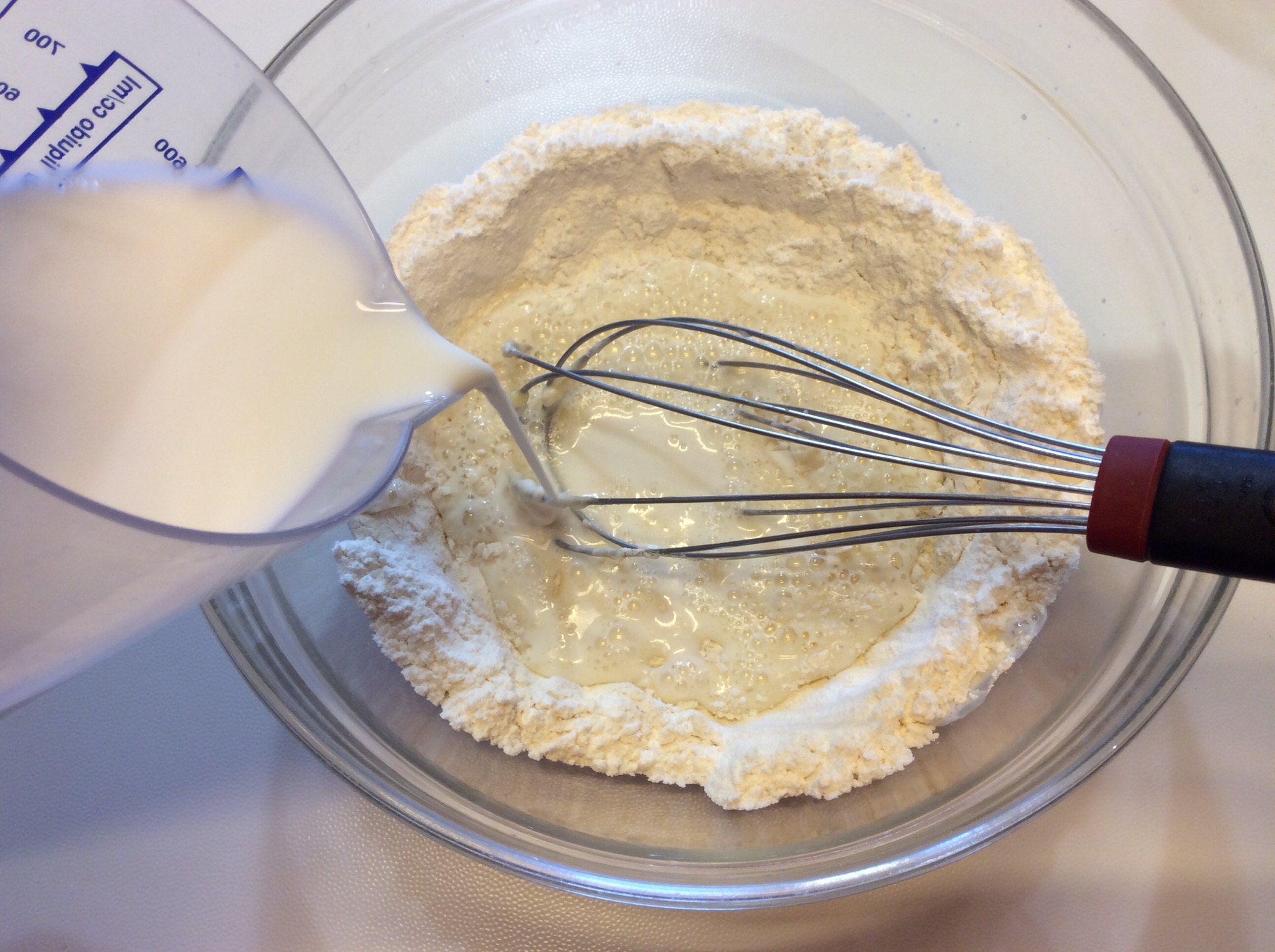 In un’altra ciotola verso la farina e aggiungo mescolando il latte e con la frusta creo una pastella
