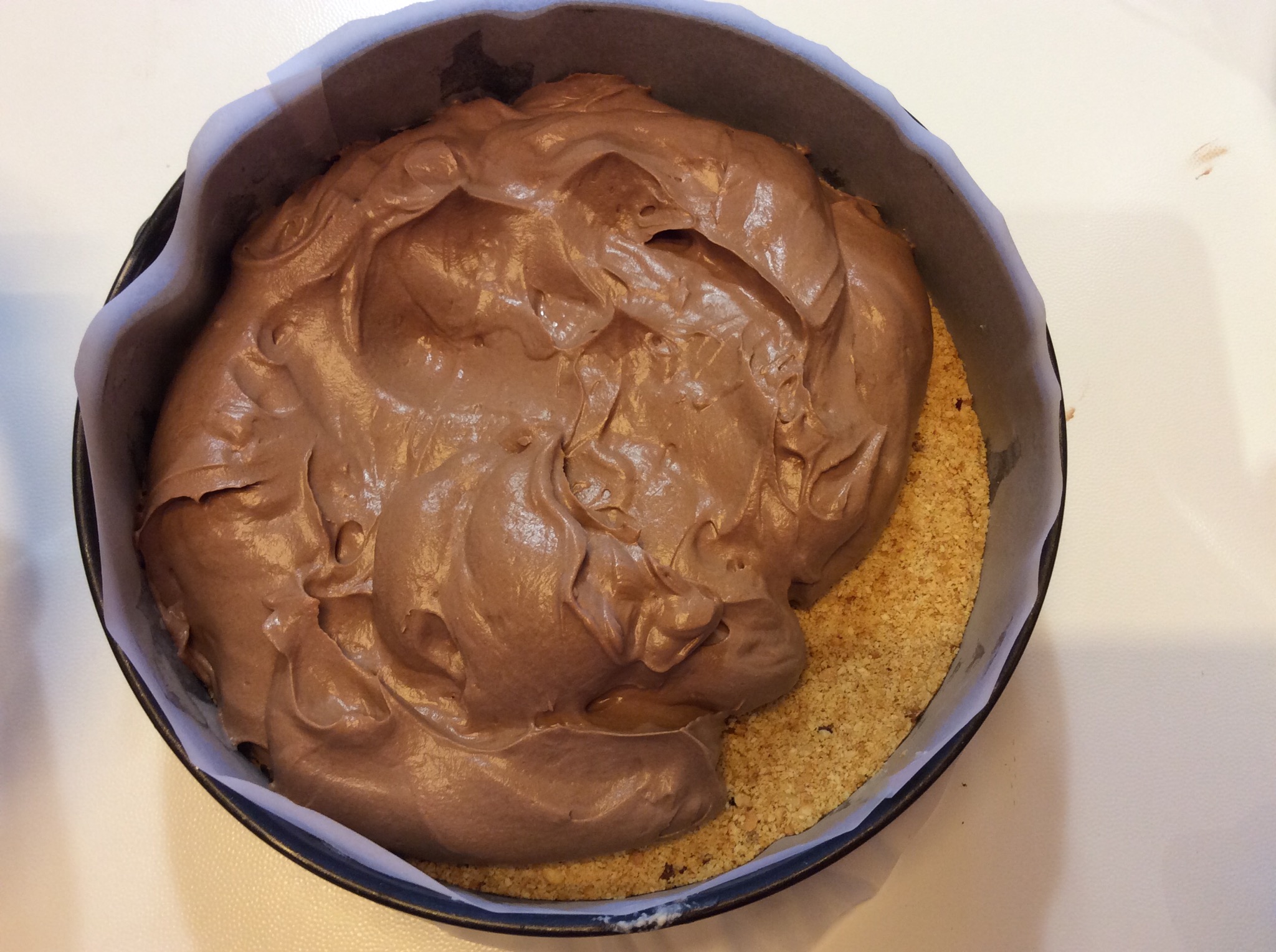 Fodero una tortiera da 22 cm con carta forno e verso i biscotti pressando bene per compattare e la ripongo in frigorifero