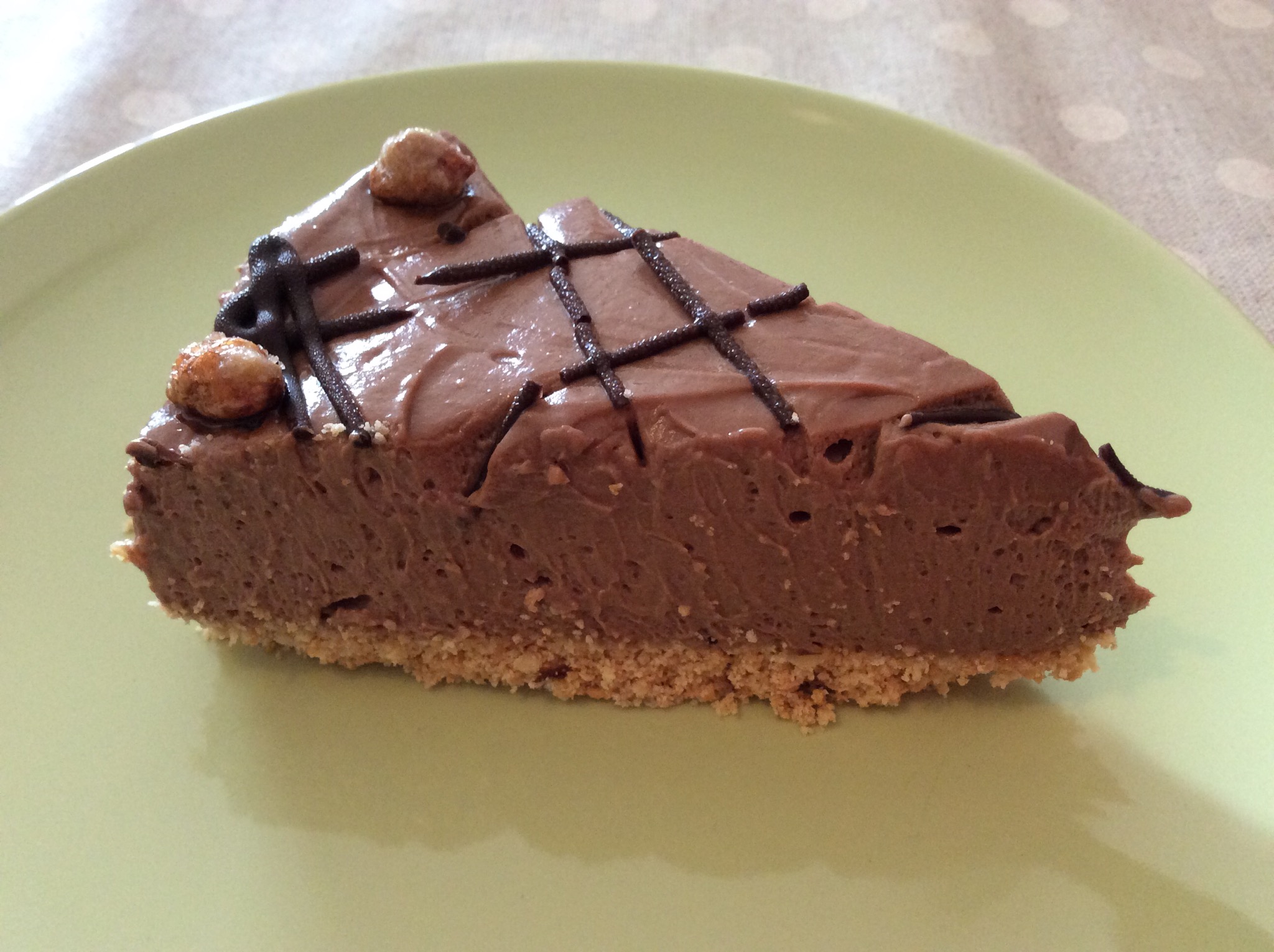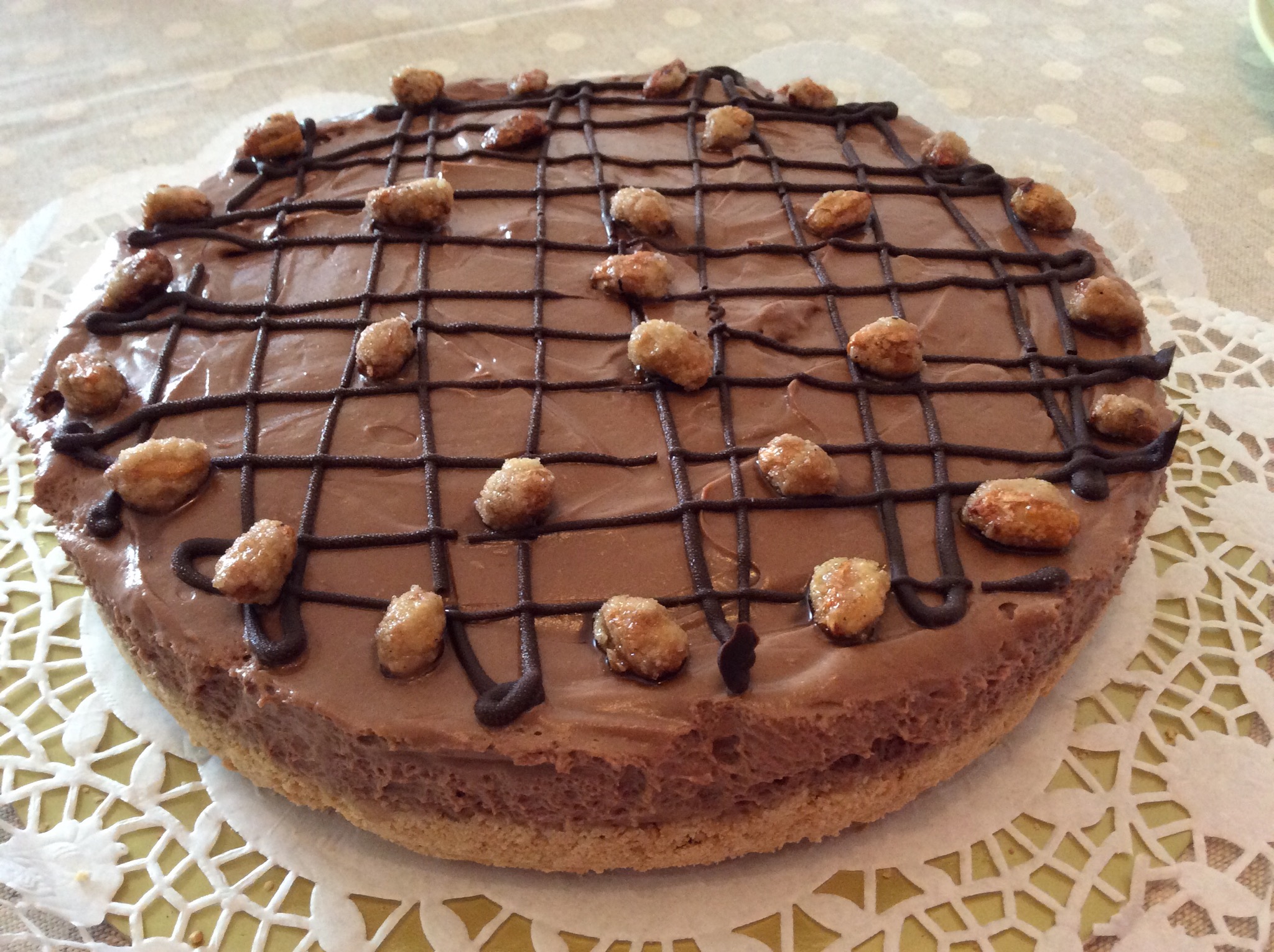 Livello bene, io ho decorato la superficie sciogliendo 50 gr di cioccolato fondente a microonde, l’ho versato in un conetto di carta forno e ho tracciato delle righe orizzontali e verticali, ho concluso con delle noccioline caramellate che avevo già pronte, ma potete decorare come preferite