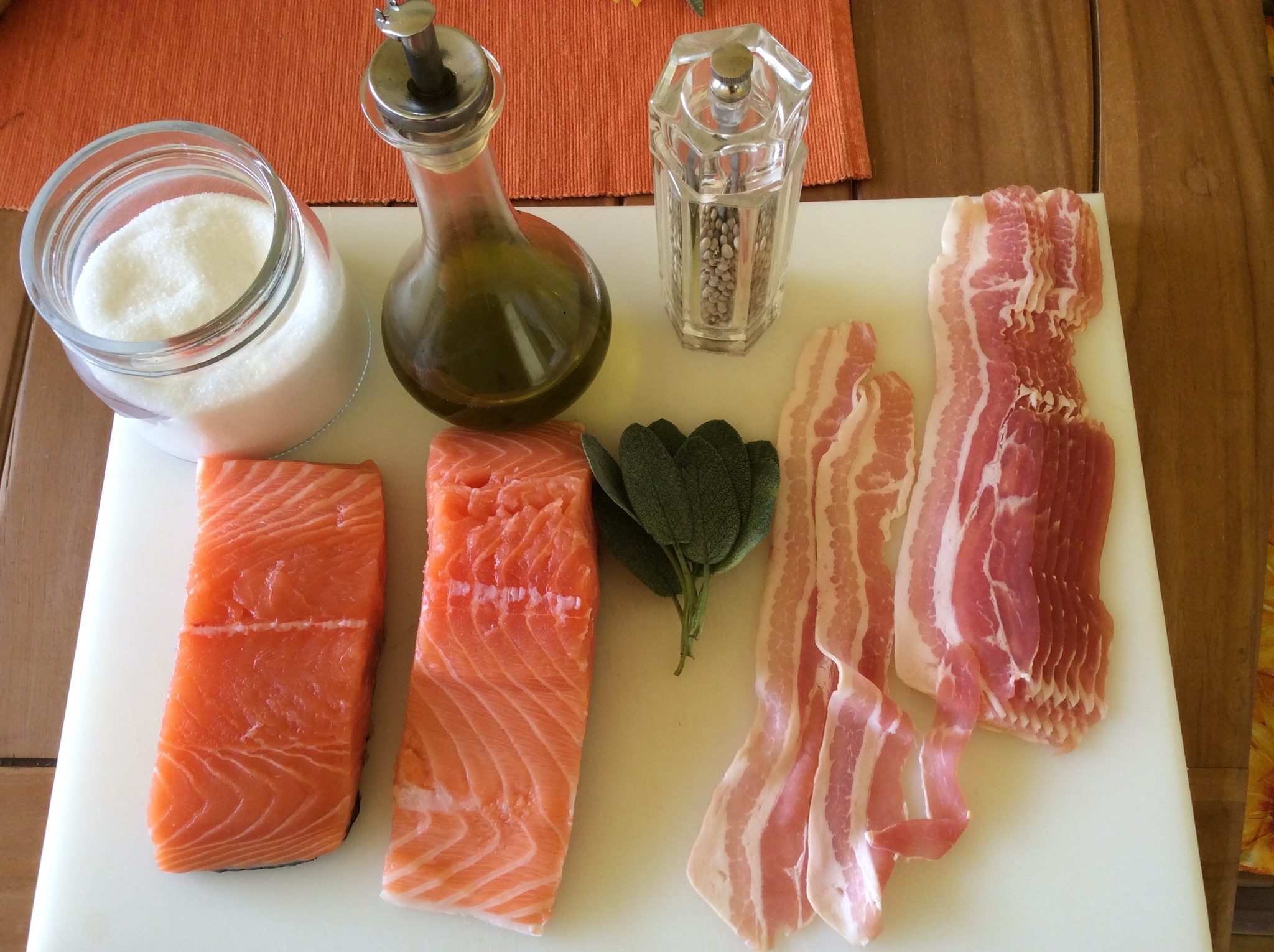 Dispongo sul tagliere le fettine di pancetta leggermente sovrapposte e appoggio il trancio di salmone sopra allineo 3 foglie di salvia