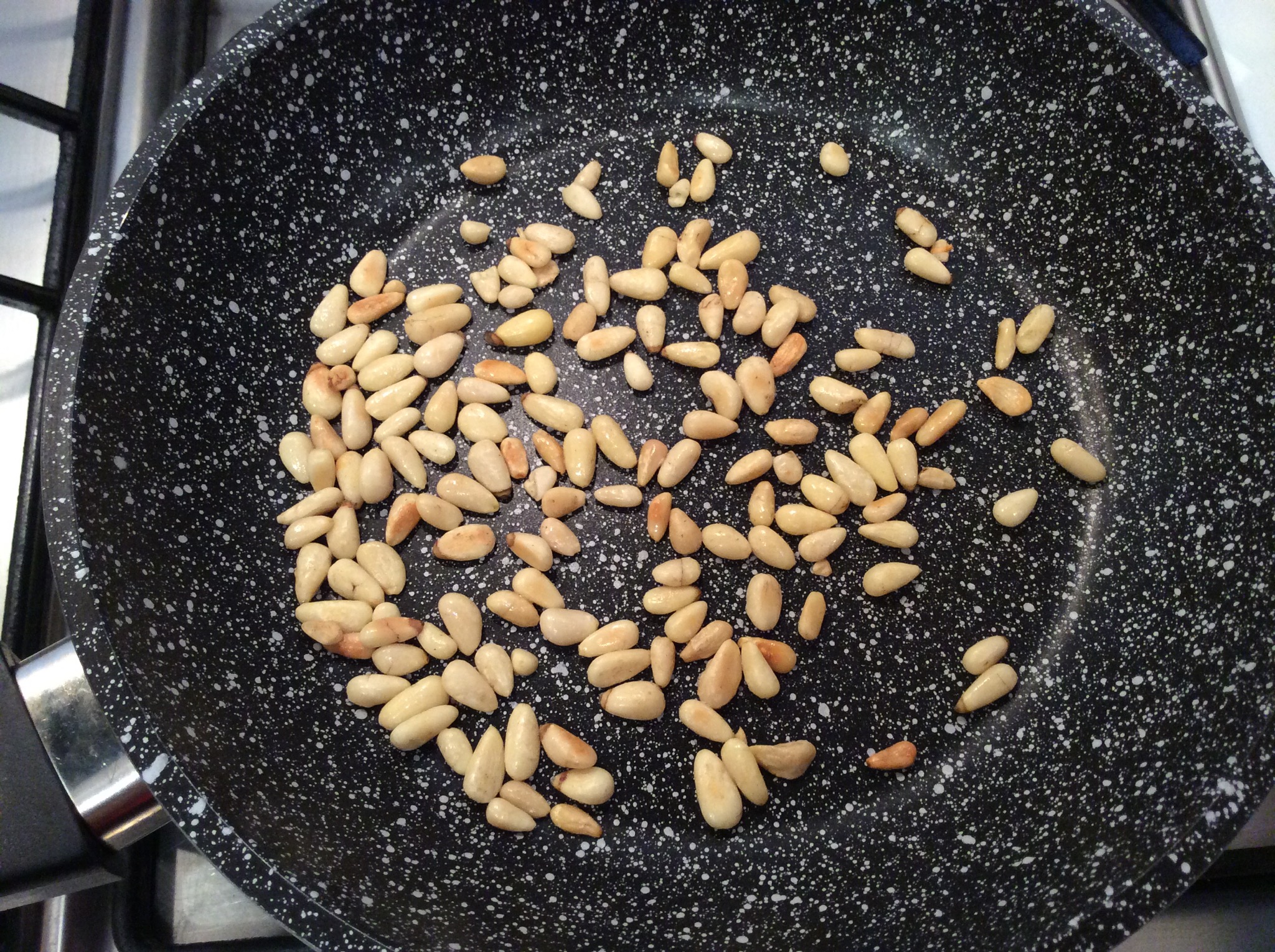 In un pentolino caldo faccio tostare i pinoli, devono dorare sprigionando così il loro aroma