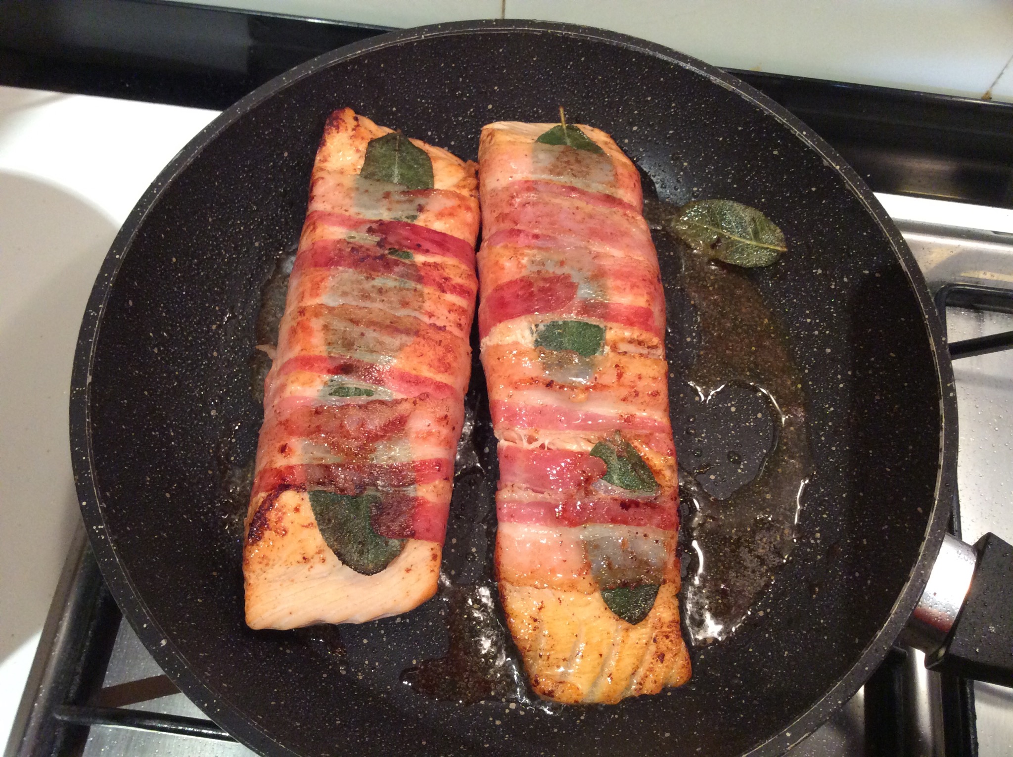 Finisco la cottura, circa 10 minuti, giro il salmone anche sui lati deve dorare in maniera uniforme, salo leggermente perché la pancetta è già saporita, macino poco pepe