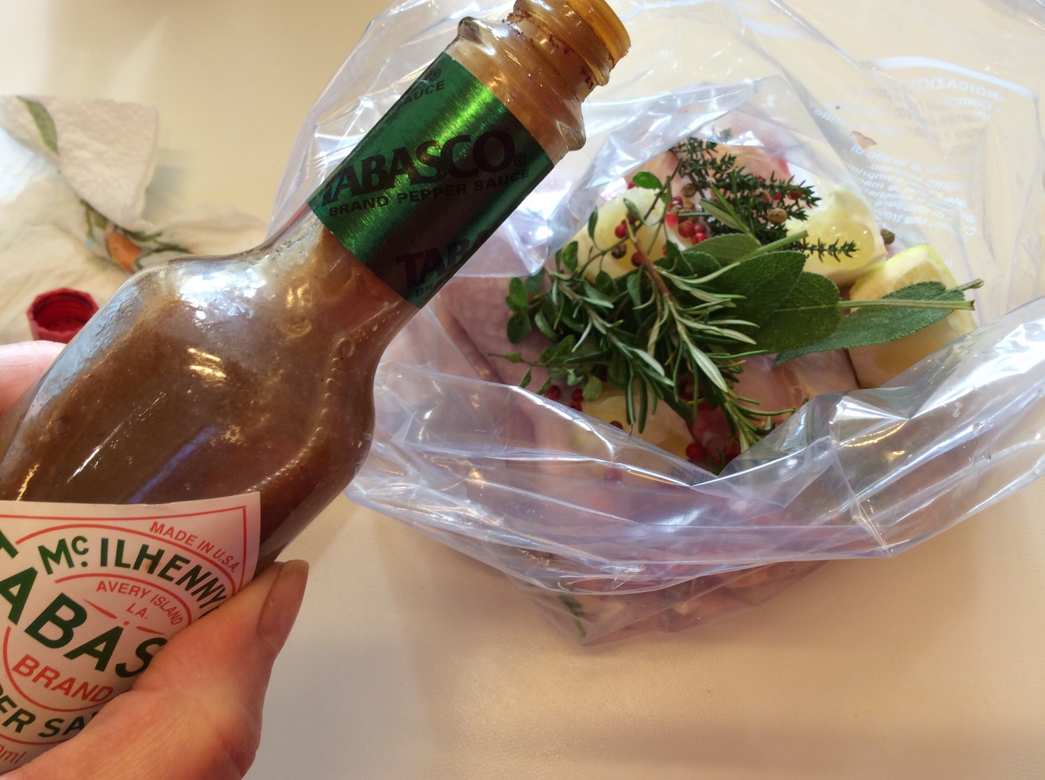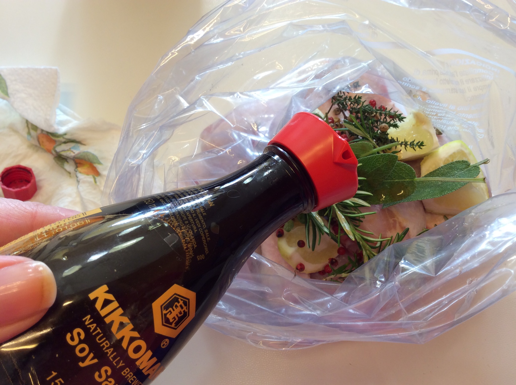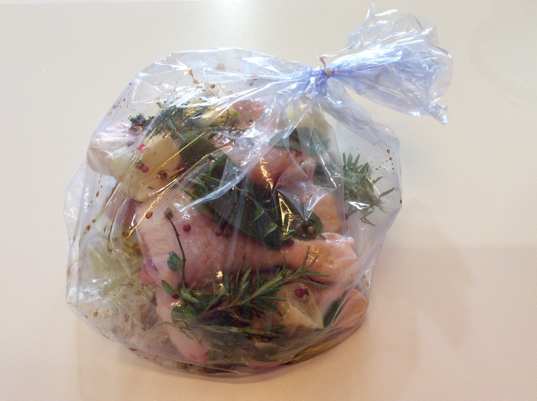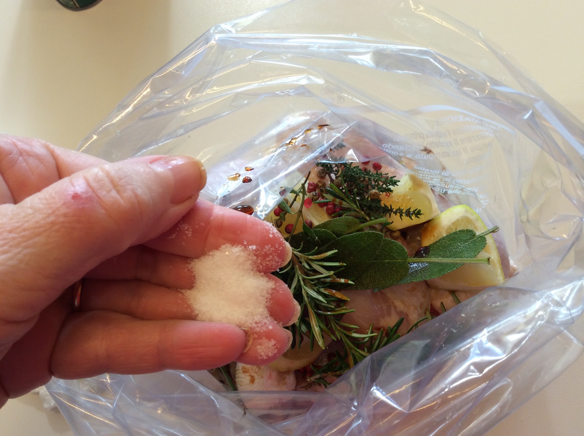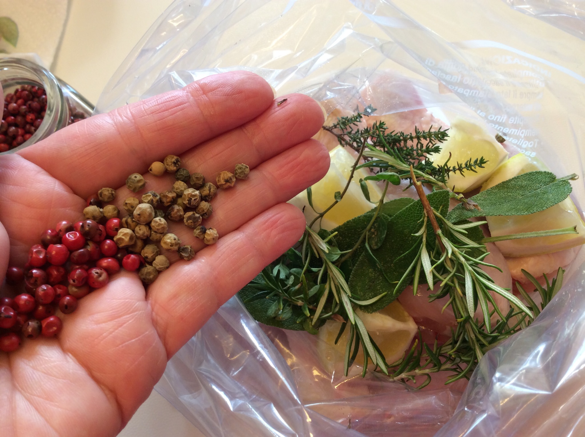 Dopo aver lavato, asciugato il pollo tolgo eventuali pelucchi attaccati e lo sistemo in un grande sacchetto per alimenti con il limone tagliato a pezzi, le erbe aromatiche, il pepe verde e rosa