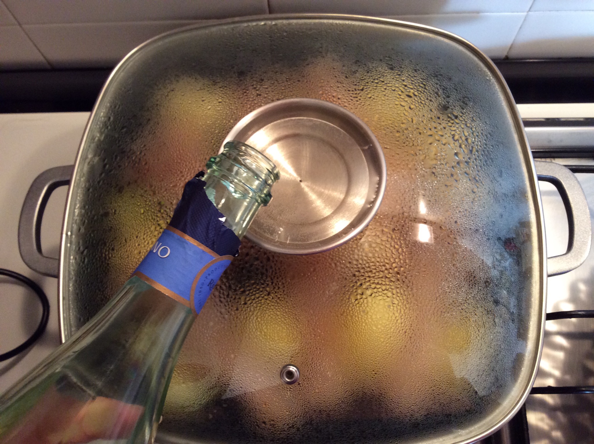 Lascio rosolare da entrambi i lati sfumate con il vino bianco e coprite, io ho questa pentola e posso versare il vino nel contenitore sul coperchio e cade goccia a goccia senza bisogno di aprire la pentola