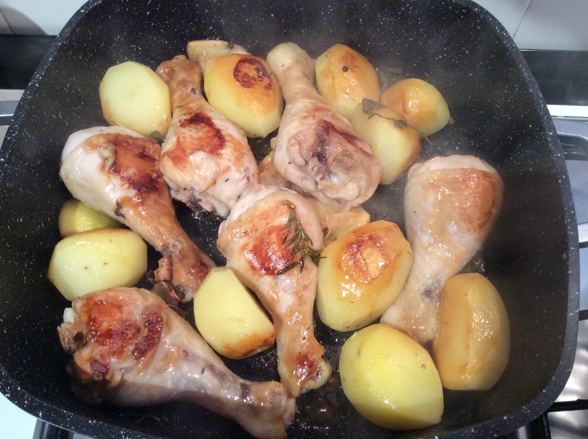 Trascorso il tempo di marinatura, scaldo una pentola antiaderente e aggiungo il pollo con tutti gli aromi e le patate precedentemente sbucciate