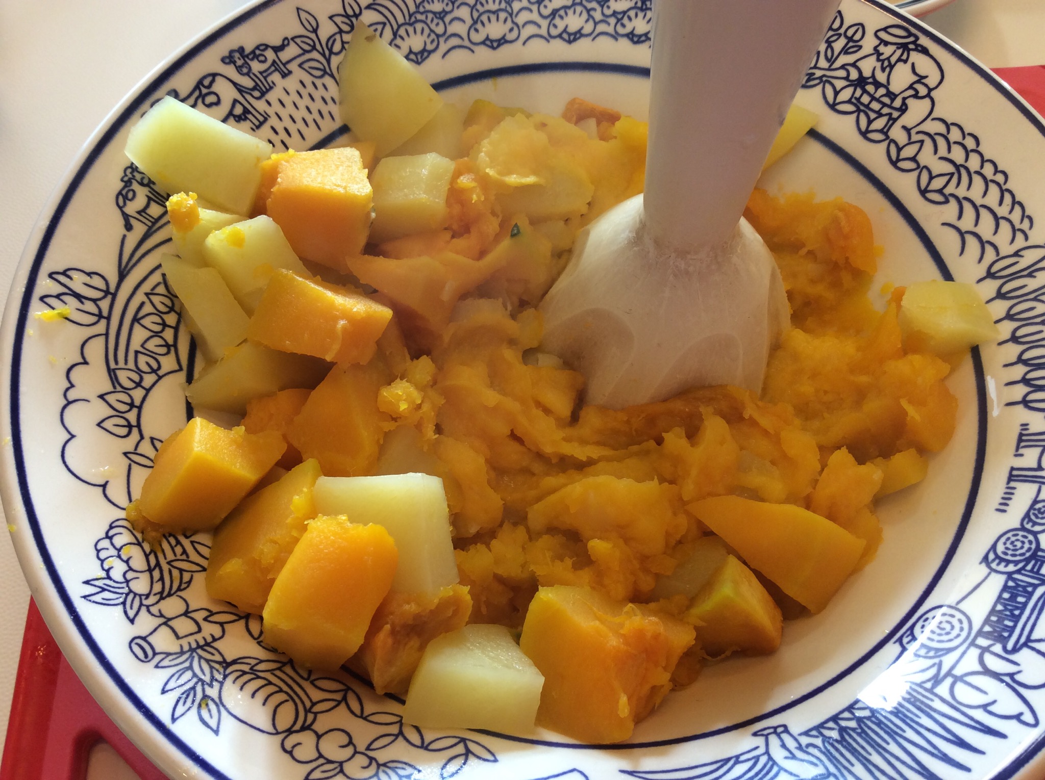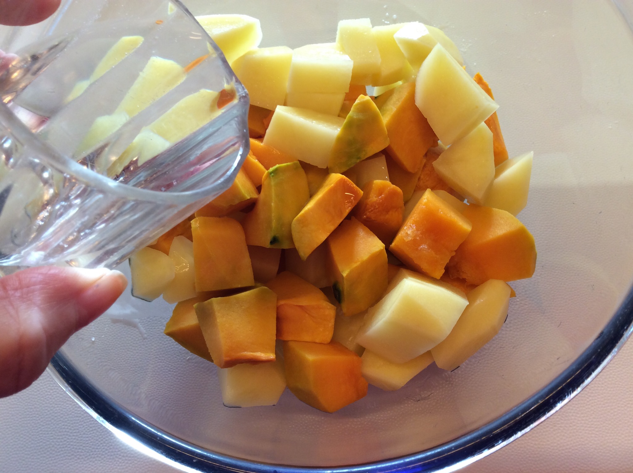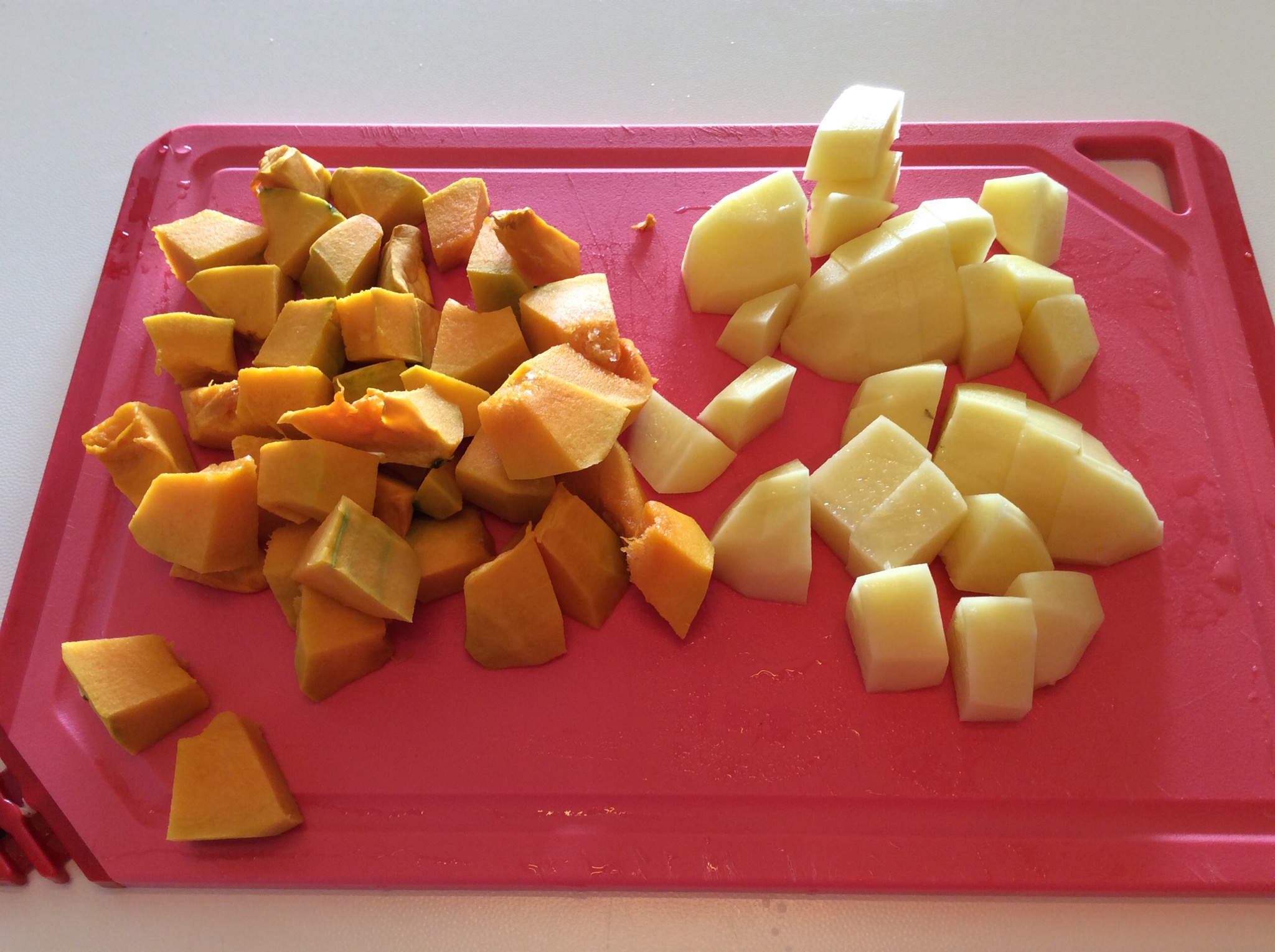 Dopo aver pulito la zucca e sbucciato le patate le taglio a pezzetti
