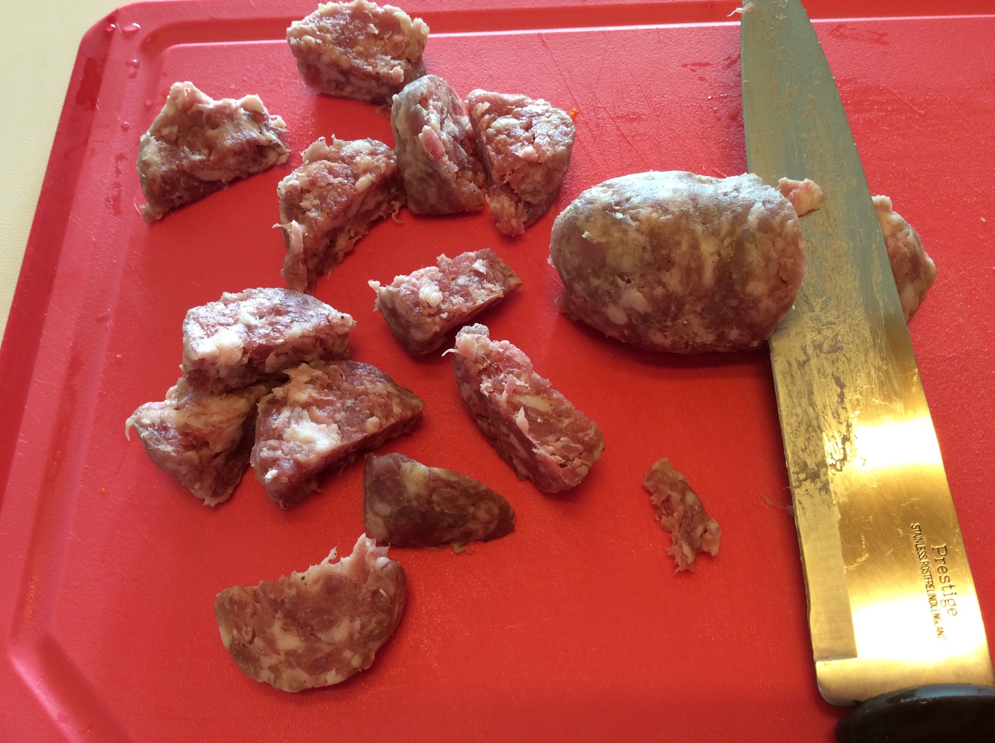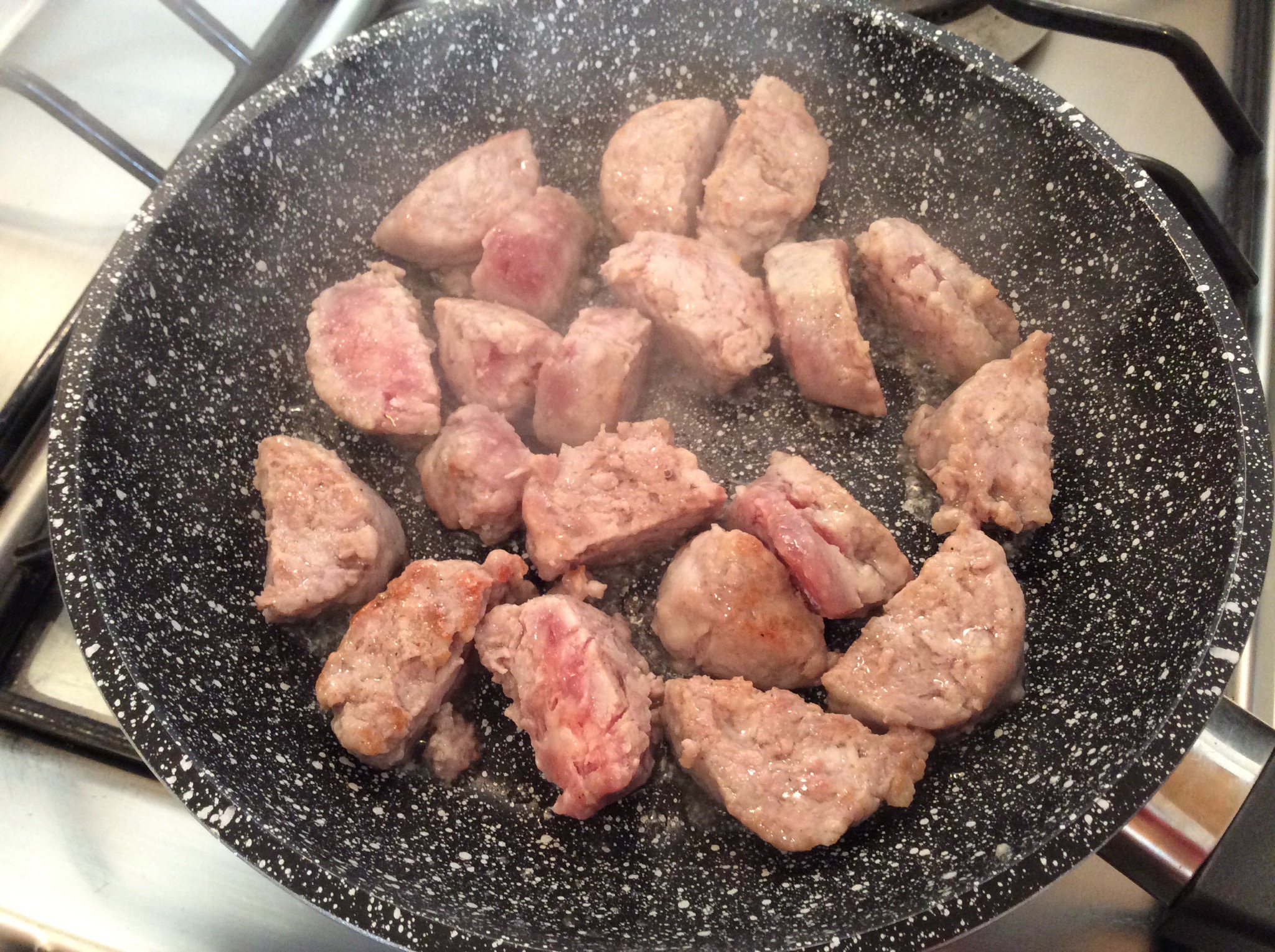 Intanto tolgo il budello alla salsiccia e la taglio a pezzi piuttosto grossi