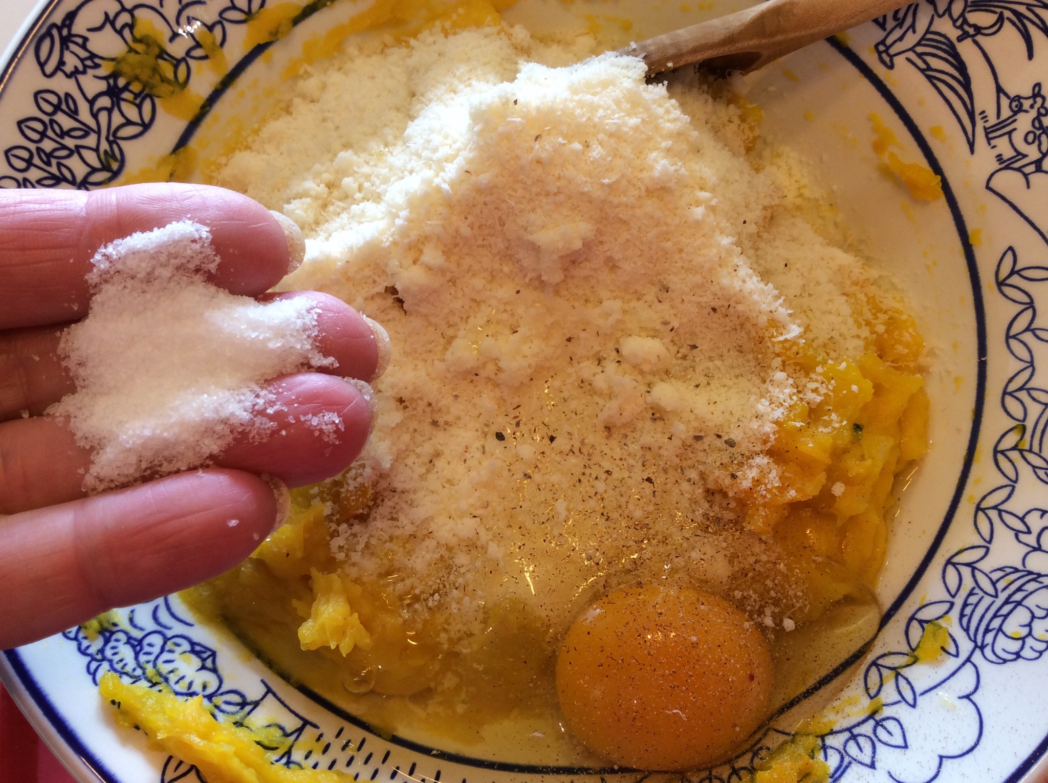 Aggiungo l’uovo, il parmigiano, una grattugiata di noce moscata e un pizzico di sale