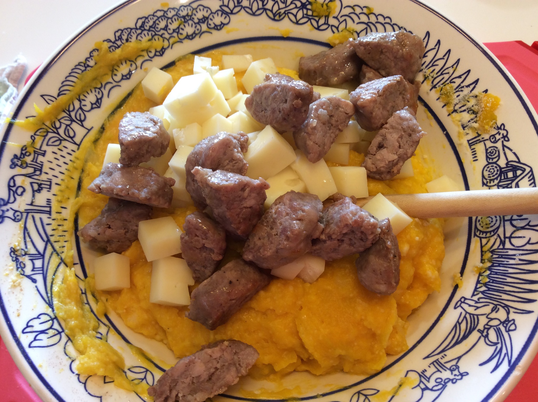 Aggiungo il formaggio tagliato a cubetti piccoli e la salsiccia sgrassata, amalgamo bene