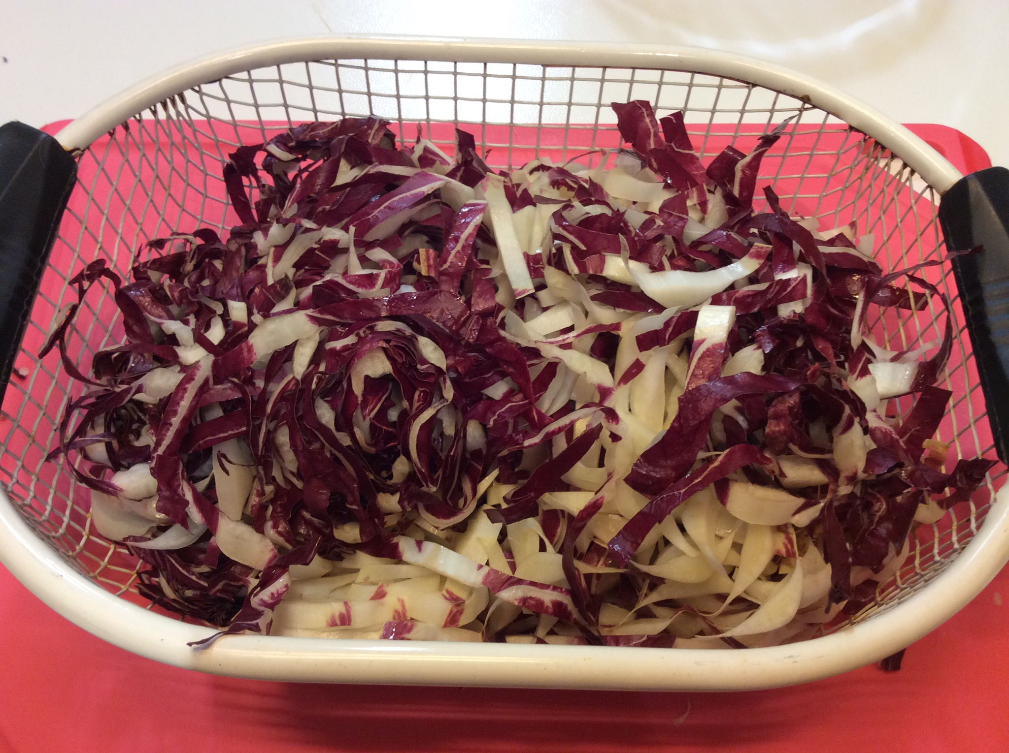 Taglio a striscioline il radicchio e lo lavo scolandolo bene