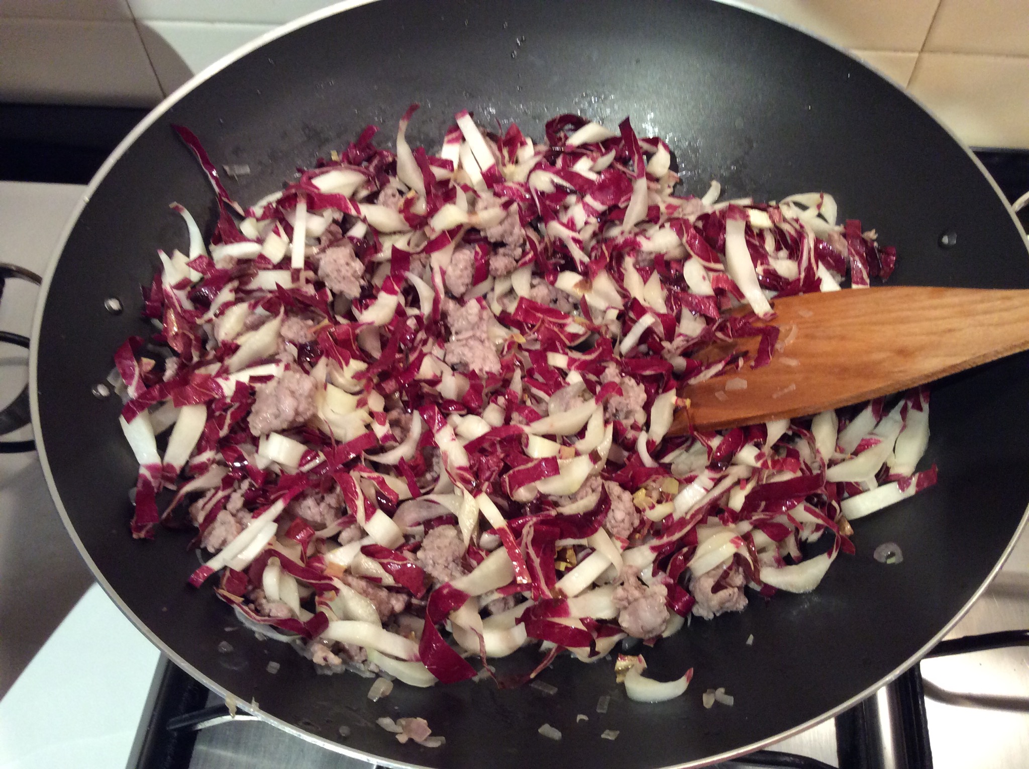 La salsiccia è ben rosolata, aggiungo il radicchio e lo lascio appassire