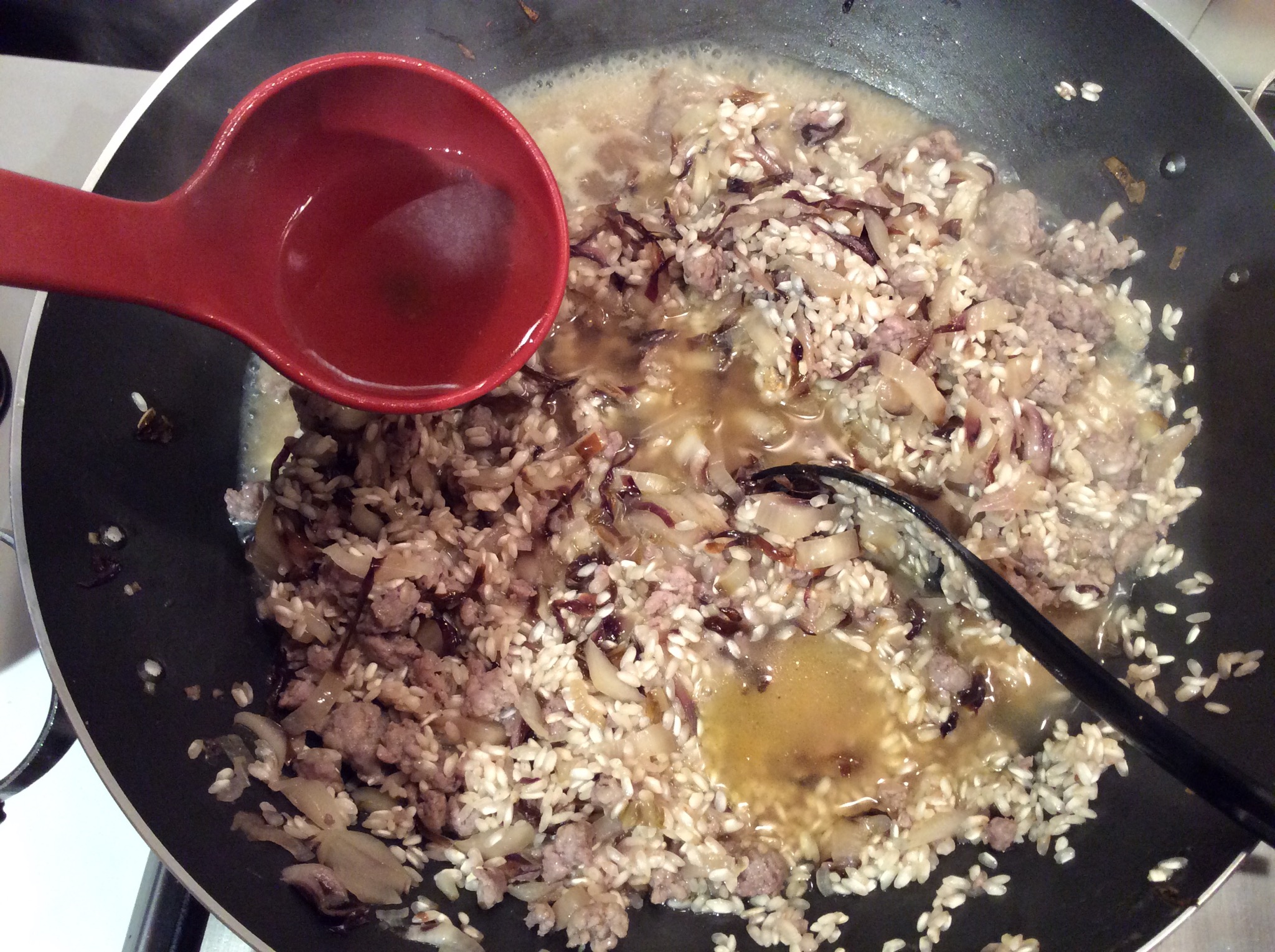 Quando il vino è sfumato aggiungo il brodo poco per volta sempre mescolando