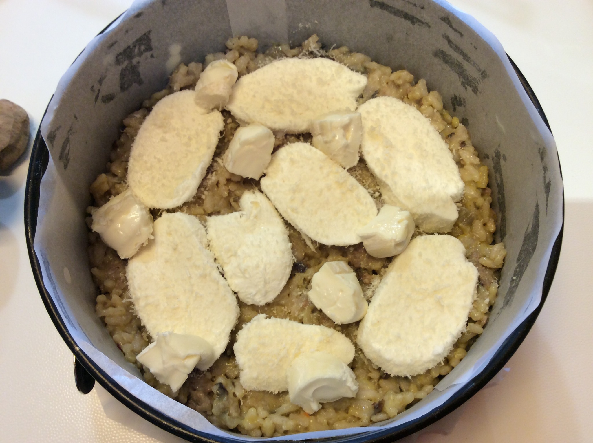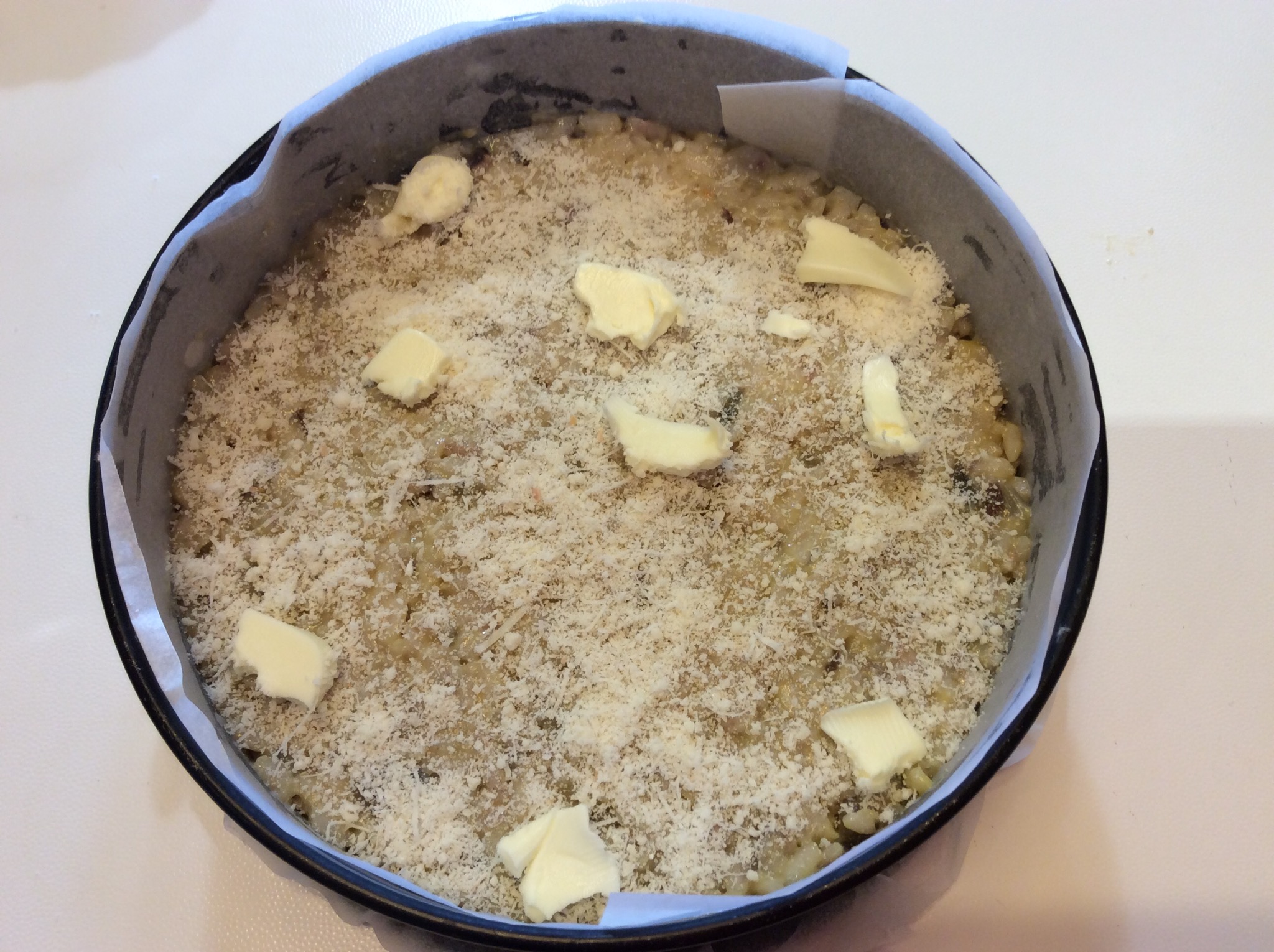 Rivesto una piccola tortiera con carta forno e verso metà del risotto livellandolo e compattandolo bene