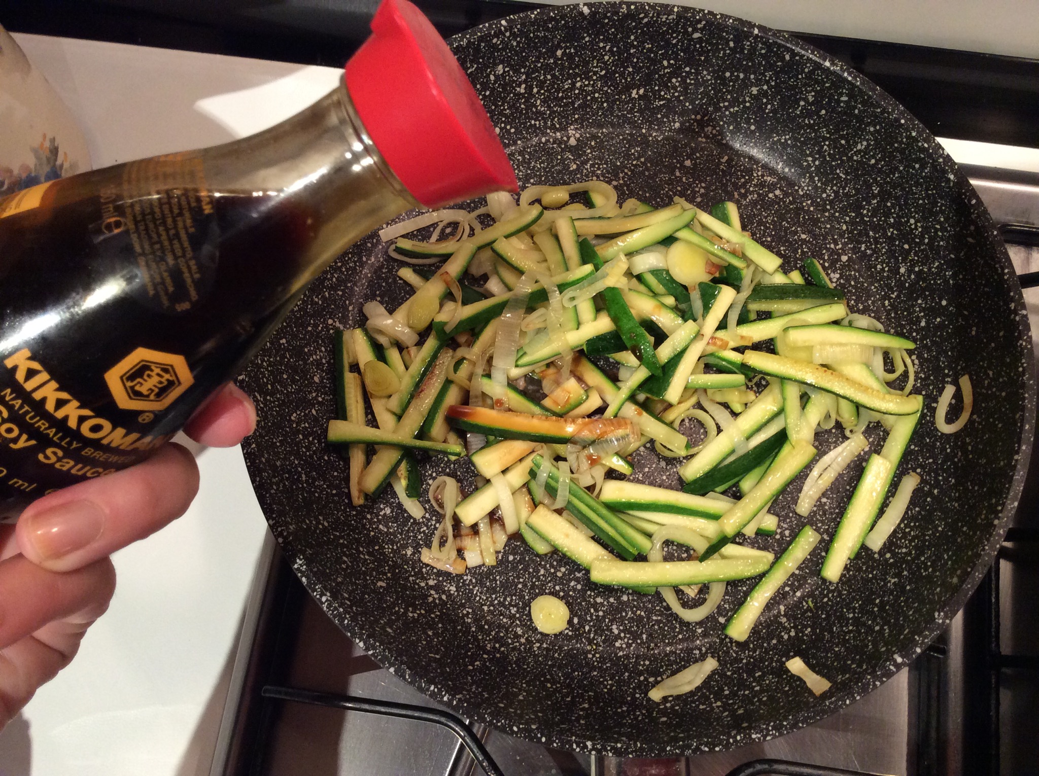 In una padella aggiungo un goccio di olio e scaldo bene, aggiungo il porro e le zucchine e le cuocio al dente, sfumo con una spruzzata di soia