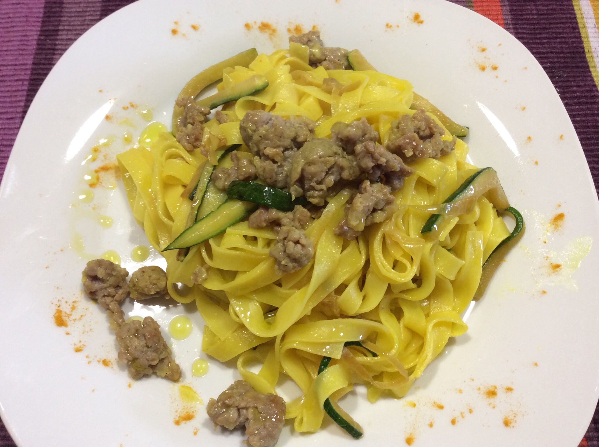 Cuocio le tagliatelle, le scolo lasciandole umide, le verso nella padella con il sugo e le salto per qualche minuto aggiungendo i fiocchetti di burro alla curcuma