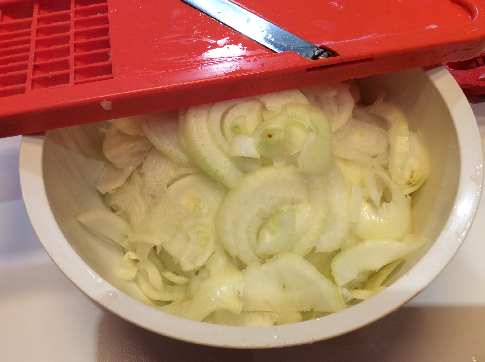 Sbuccio le cipolle e con una mandolina le affetto finemente