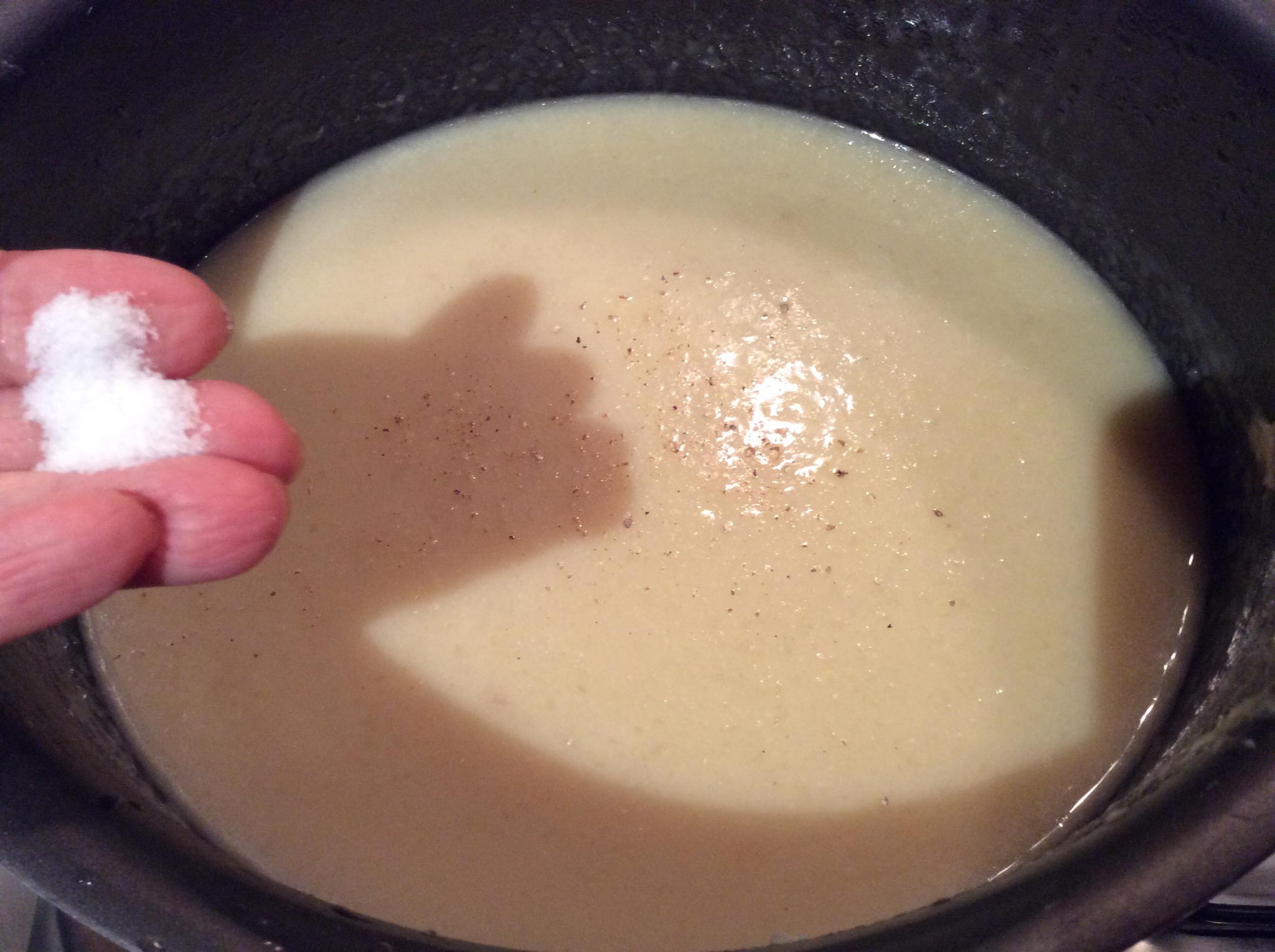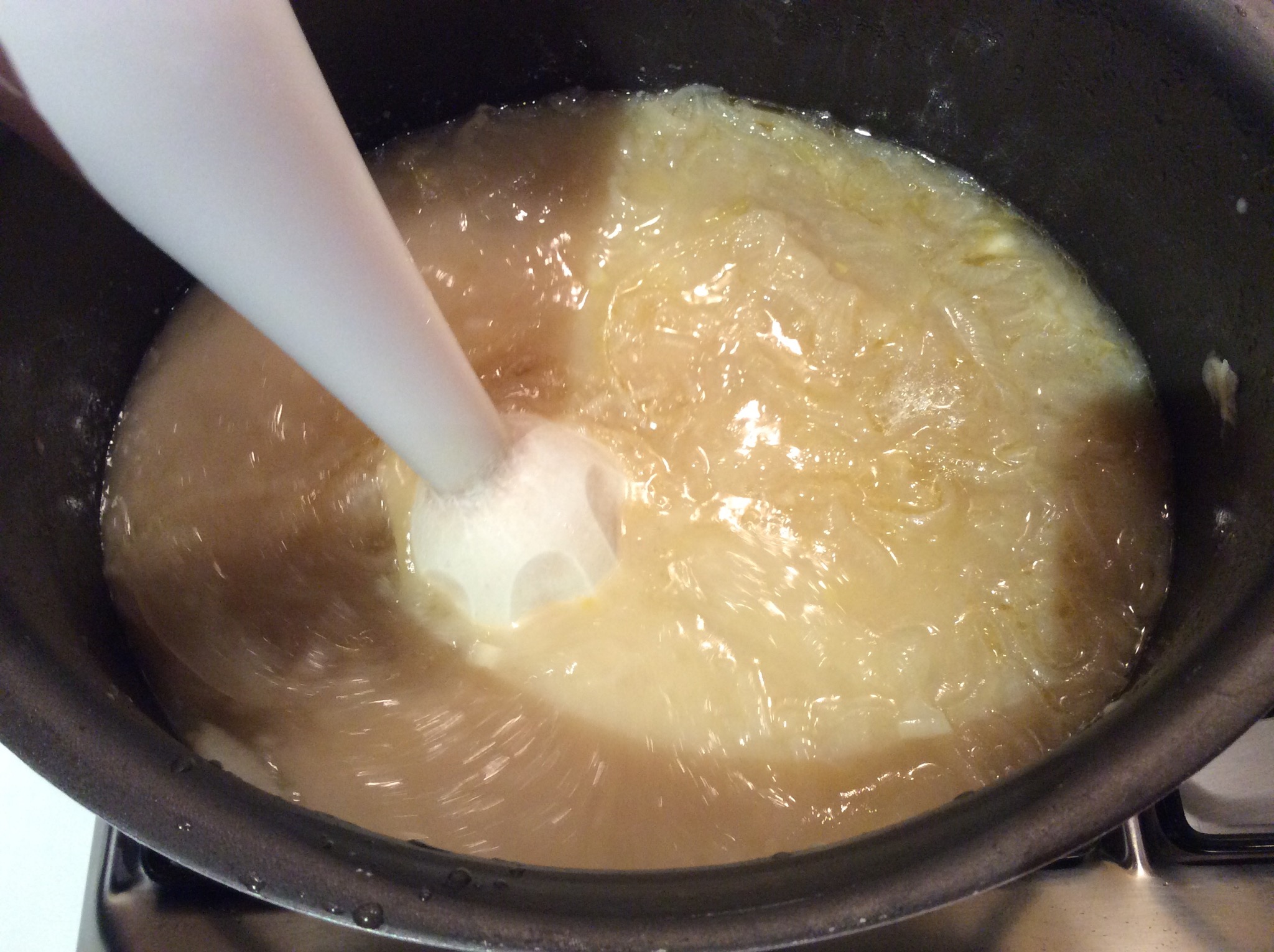 Frullo la zuppa con un mixer ad immersione non troppo finemente lasciando anche dei pezzetti