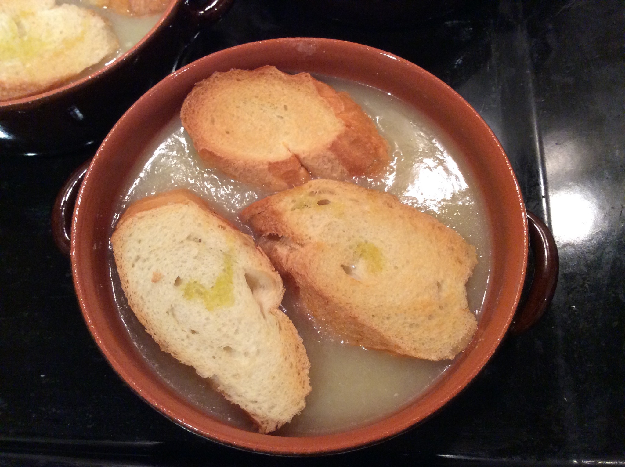 Distribuisco la zuppa bollente nelle cocottine da forno e appoggio le fettine di pane