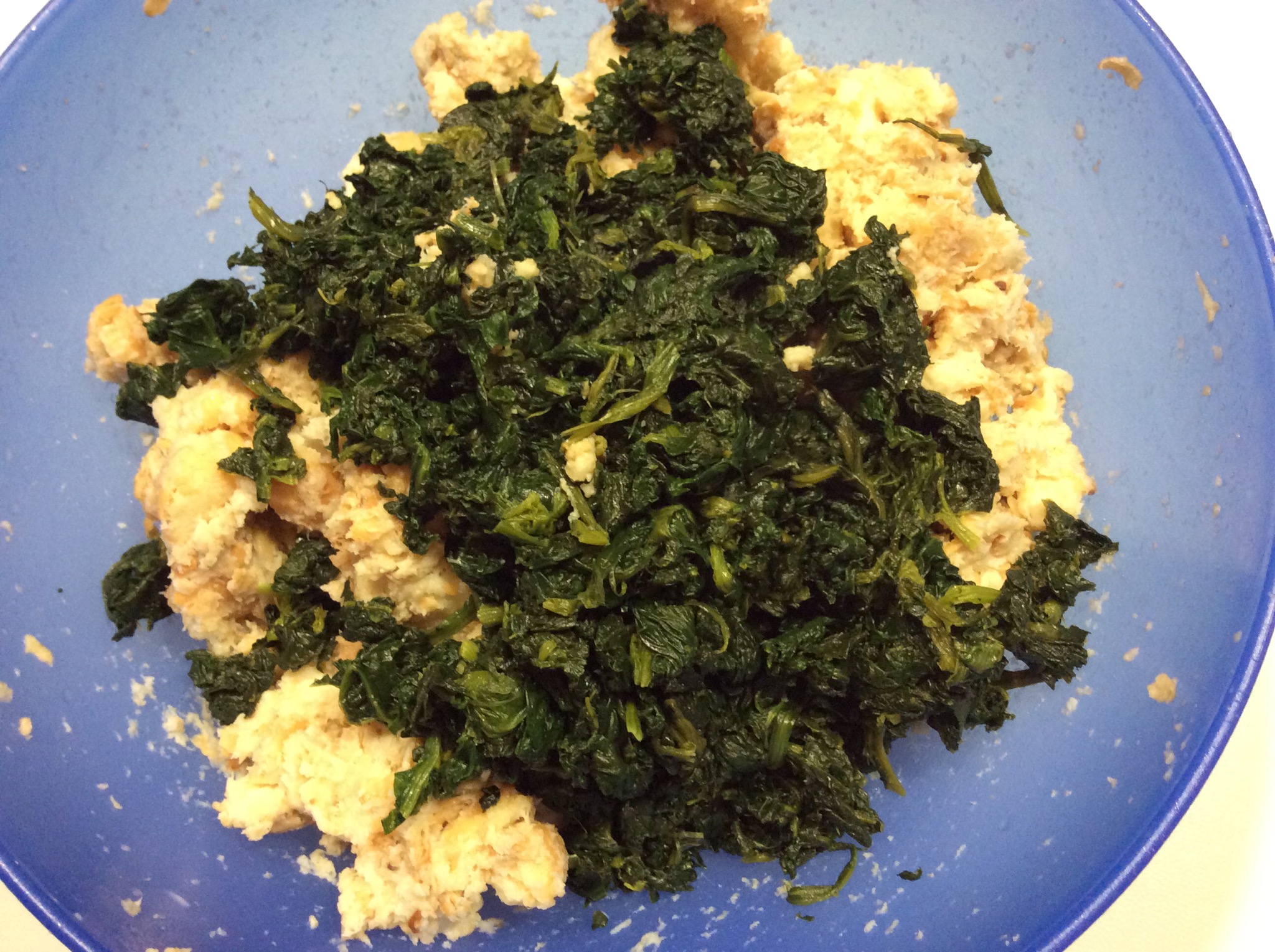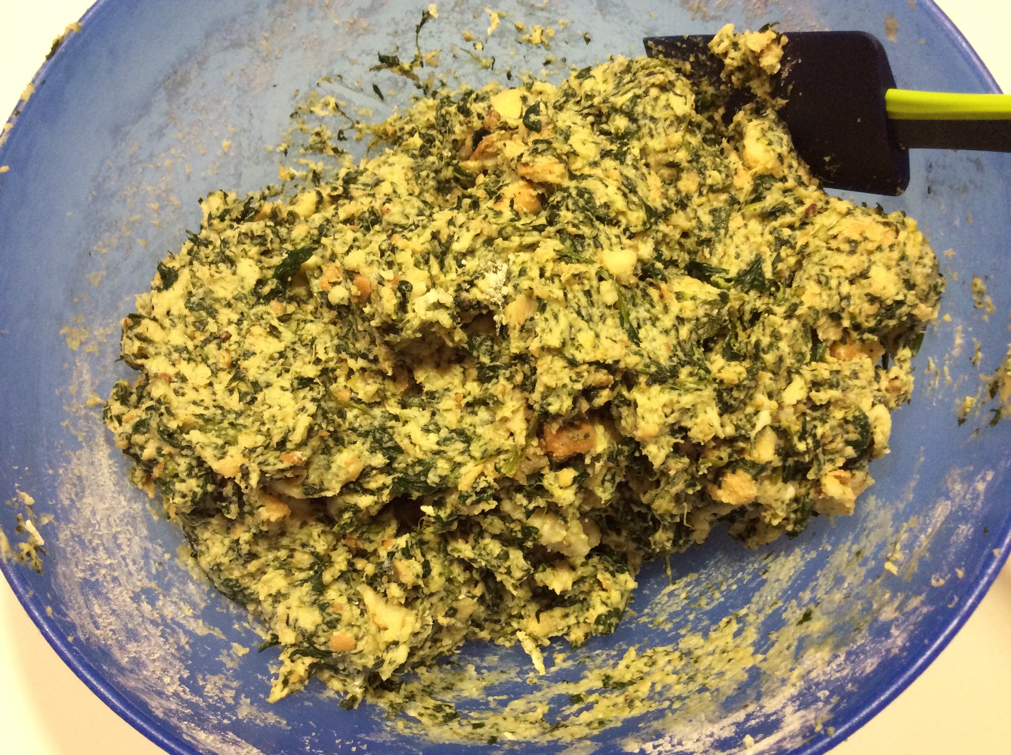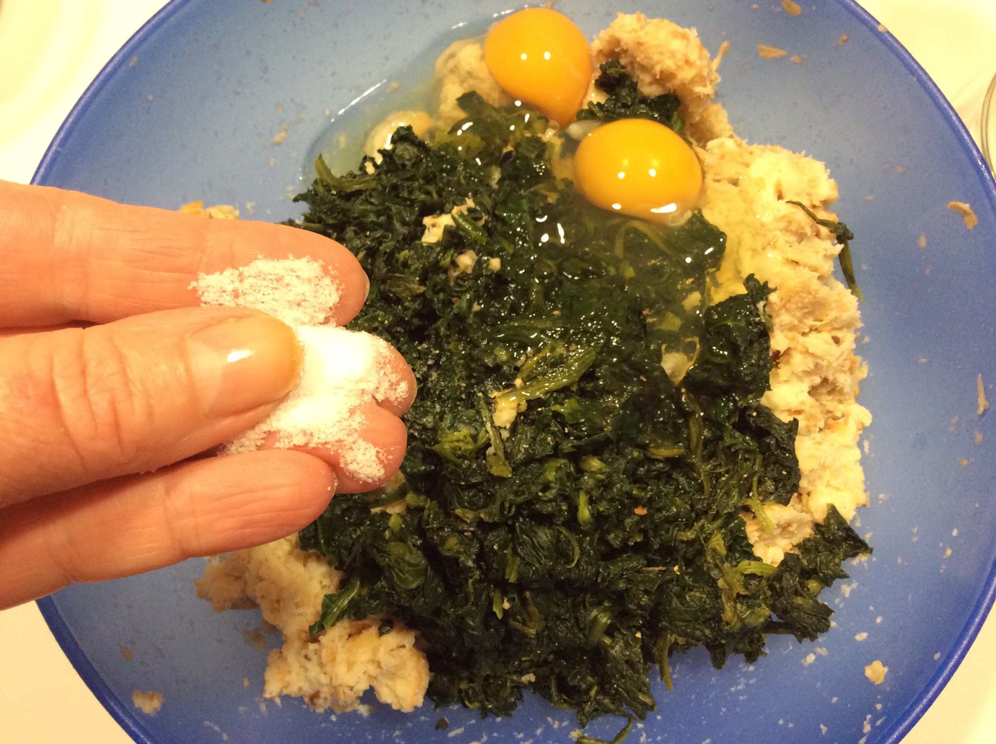 Poi con le mani lo lavoro fino a ridurlo in poltiglia e aggiungo gli spinaci lessati e tritati a coltello finemente