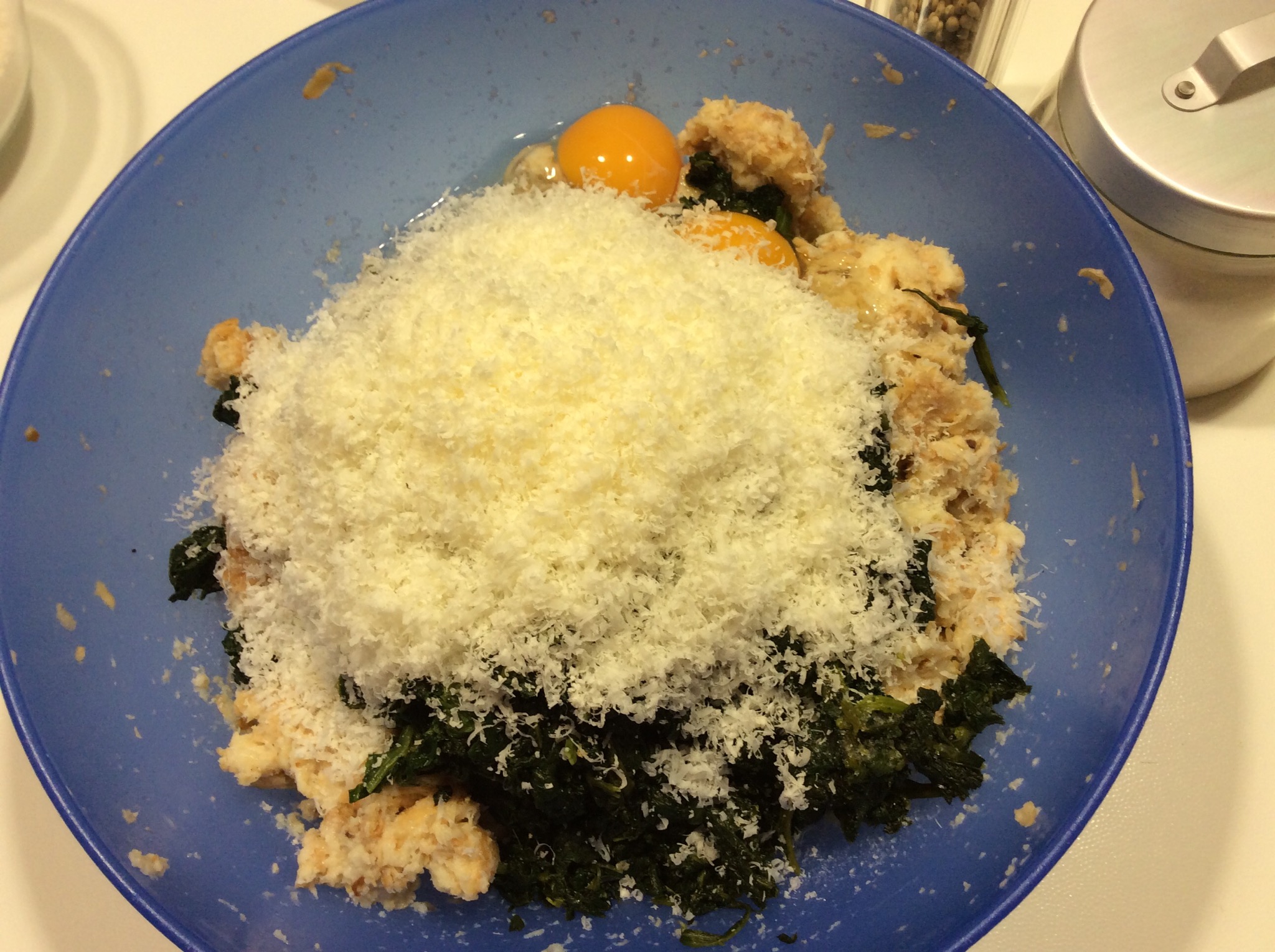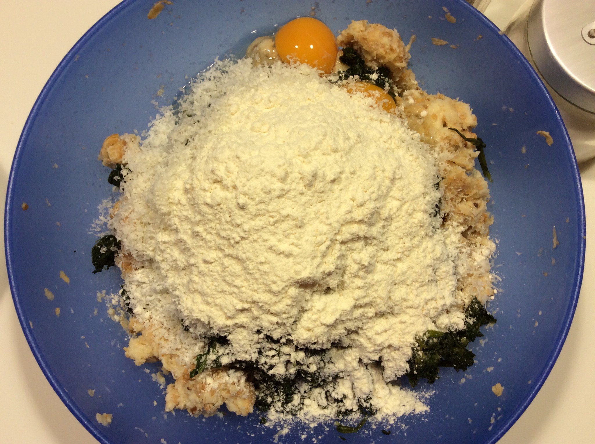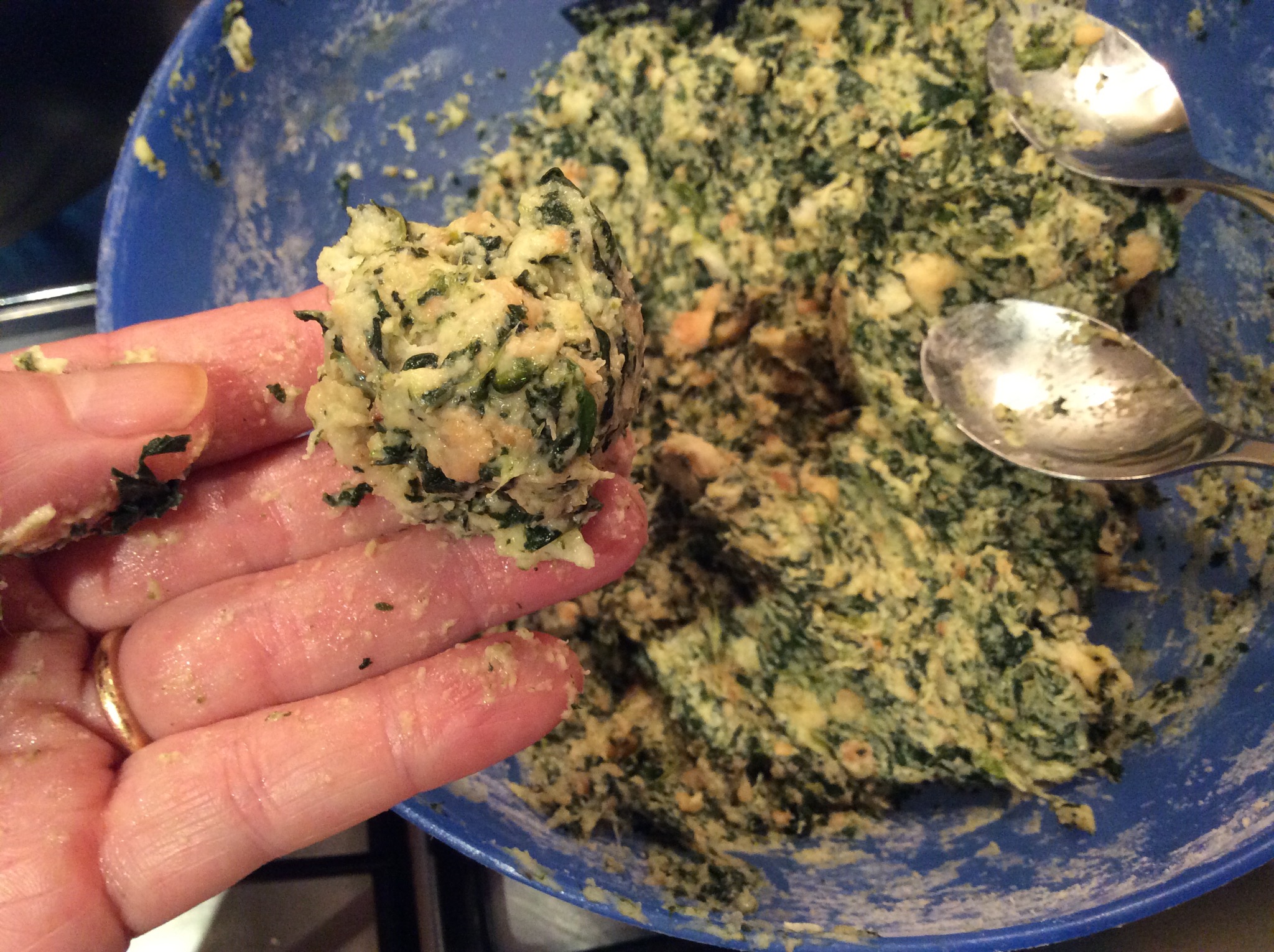 Poi con le mani lo lavoro fino a ridurlo in poltiglia e aggiungo gli spinaci lessati e tritati a coltello finemente